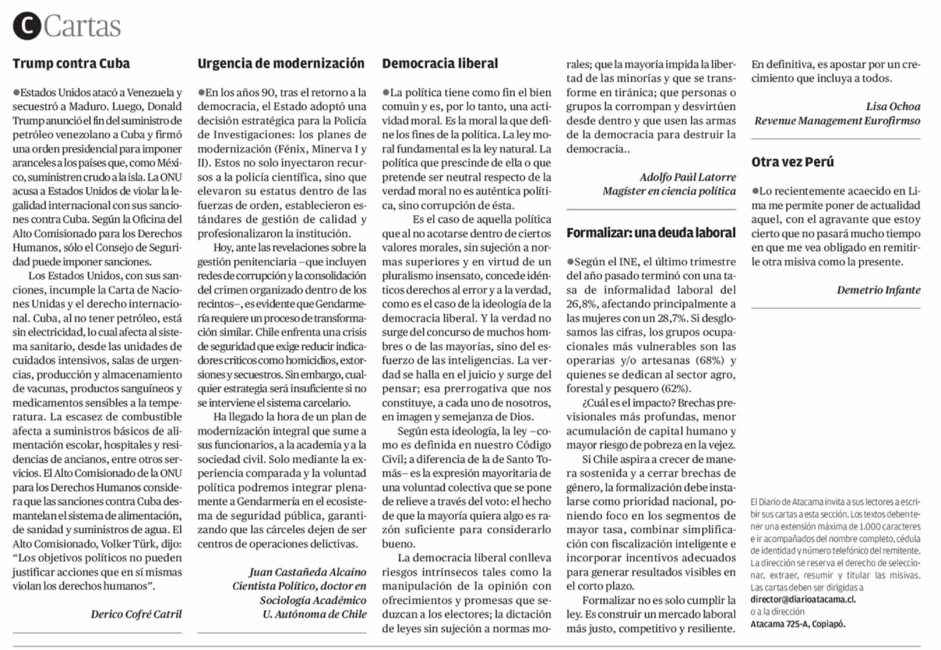 | Título: | Cartas: ·Estados Unidos atacó a Venezuela y secuestró a Maduro. Luego, Donald Trump anunció el fin del suministro de petróleo venezolano a Cuba y firmó una orden presidencial para imponer aranceles a los países que, como México, suministren crudo a la isla. La ONU acusa a Estados Unidos de violar la |