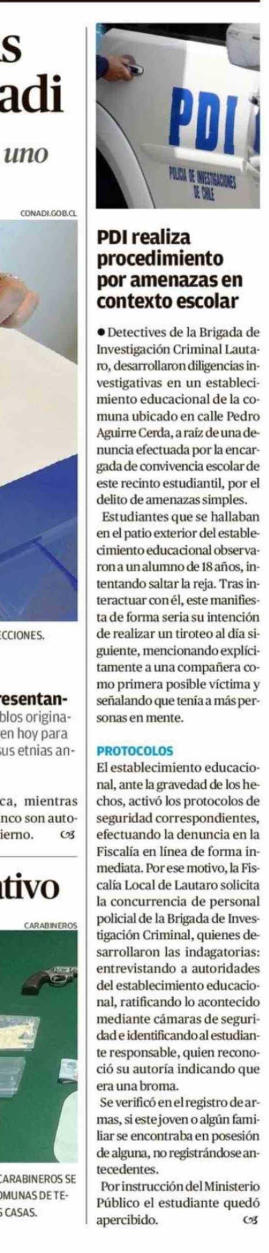 PDI realiza procedimiento por amenazas en contexto escolar