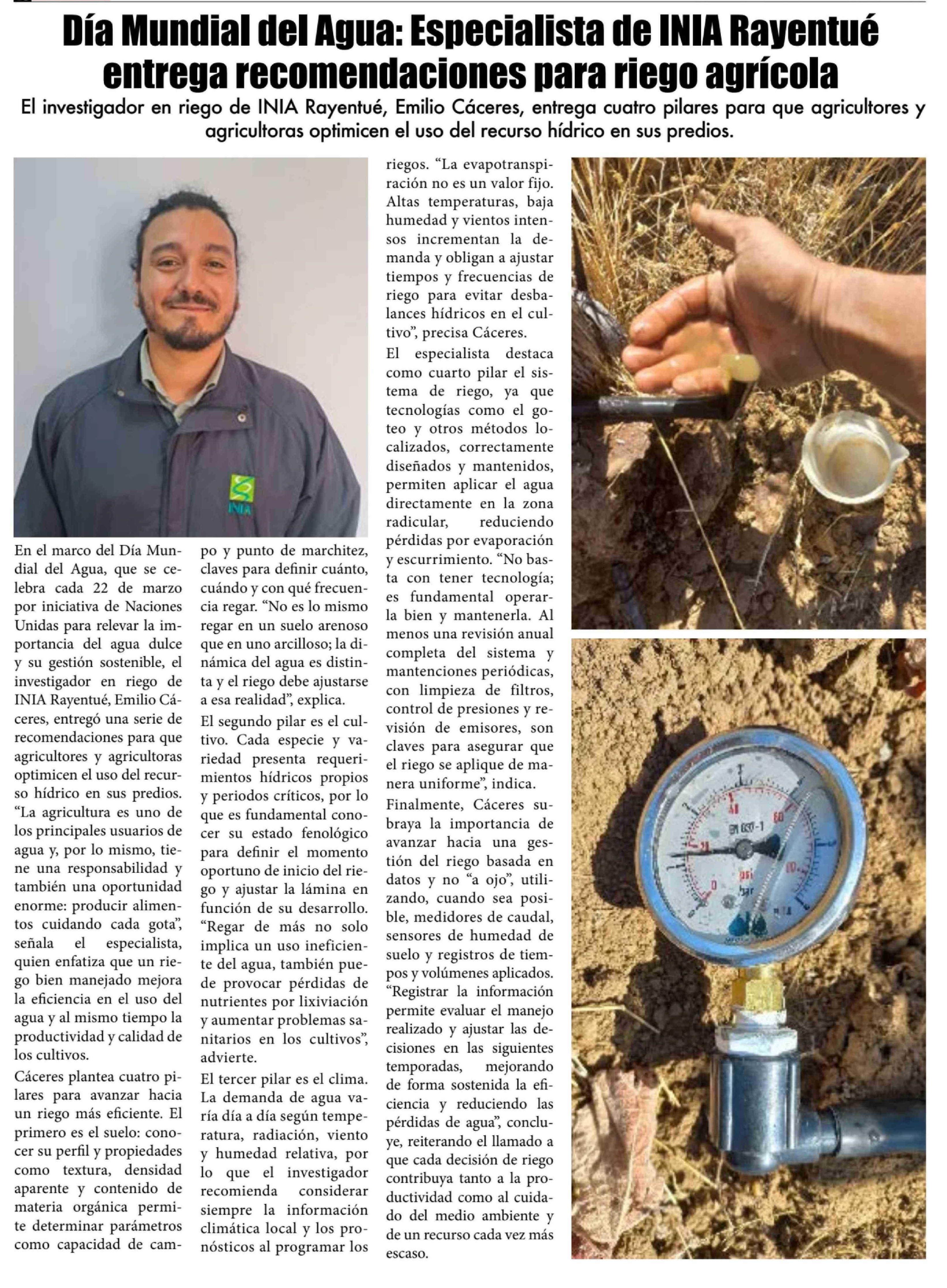 Título: Día Mundial del Agua: Especialista de INIA Rayentue entrega recomendaciones para riego agrícola