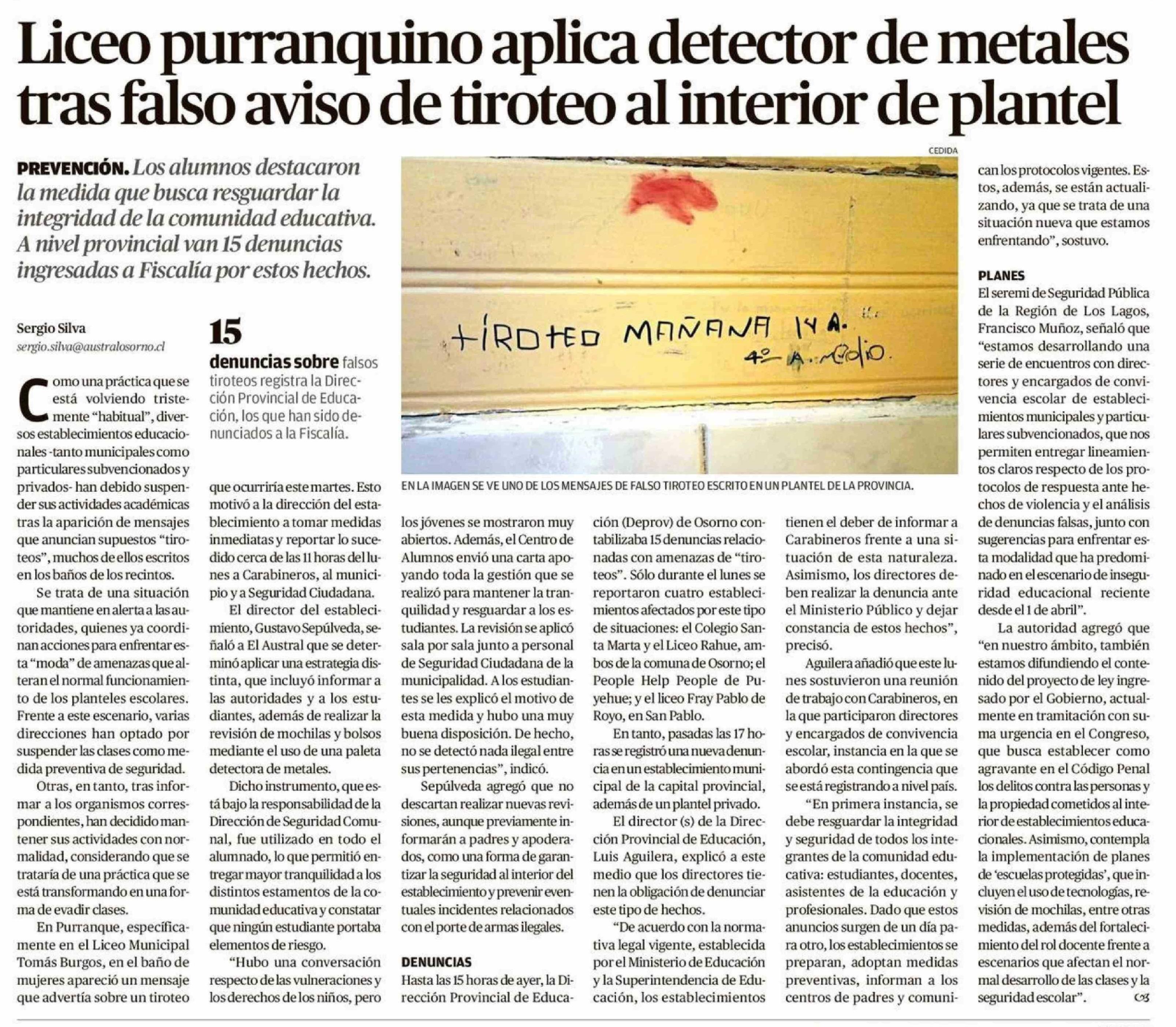 Liceo purranquino aplica detector de metales tras falso aviso de tiroteo al interior de plantel