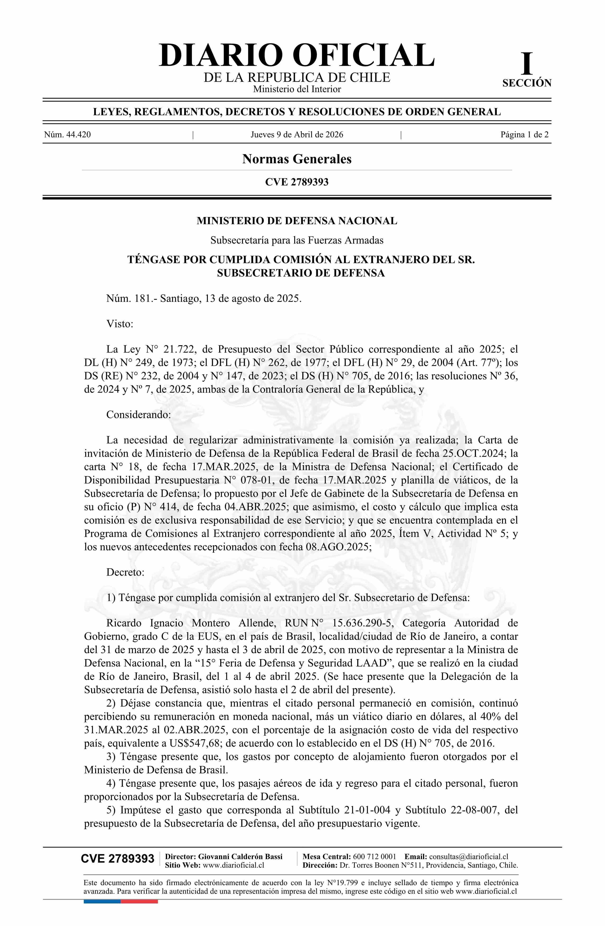 | Título: | Decreto número 181, de 2025.- Tiene por cumplida comisión al extranjero de don Ricardo Ignacio Montero Allende, Subsecretario de Defensa |