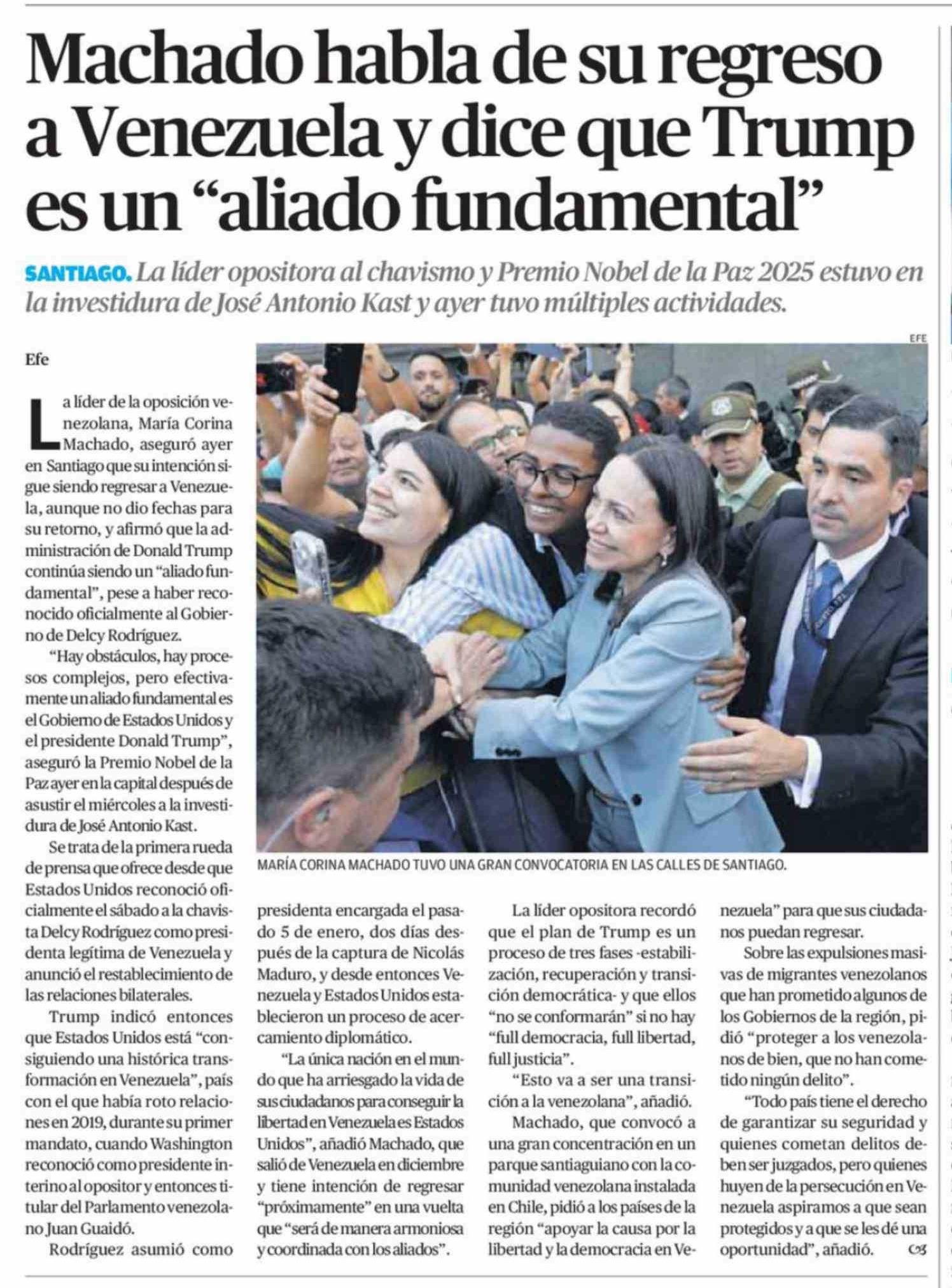 Machado habla de su regreso a Venezuela y dice que Trump es un "aliado fundamental"