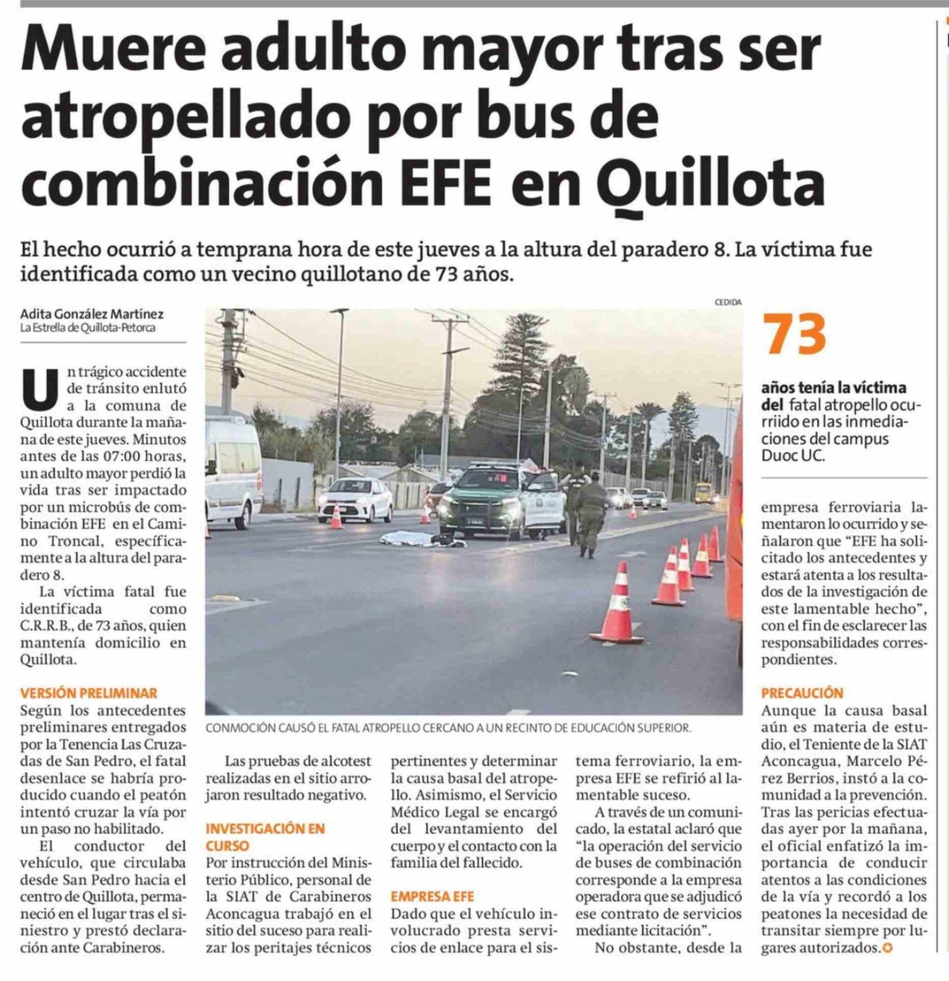 Muere adulto mayor tras ser atropellado por bus de combinación EFE en Quillota