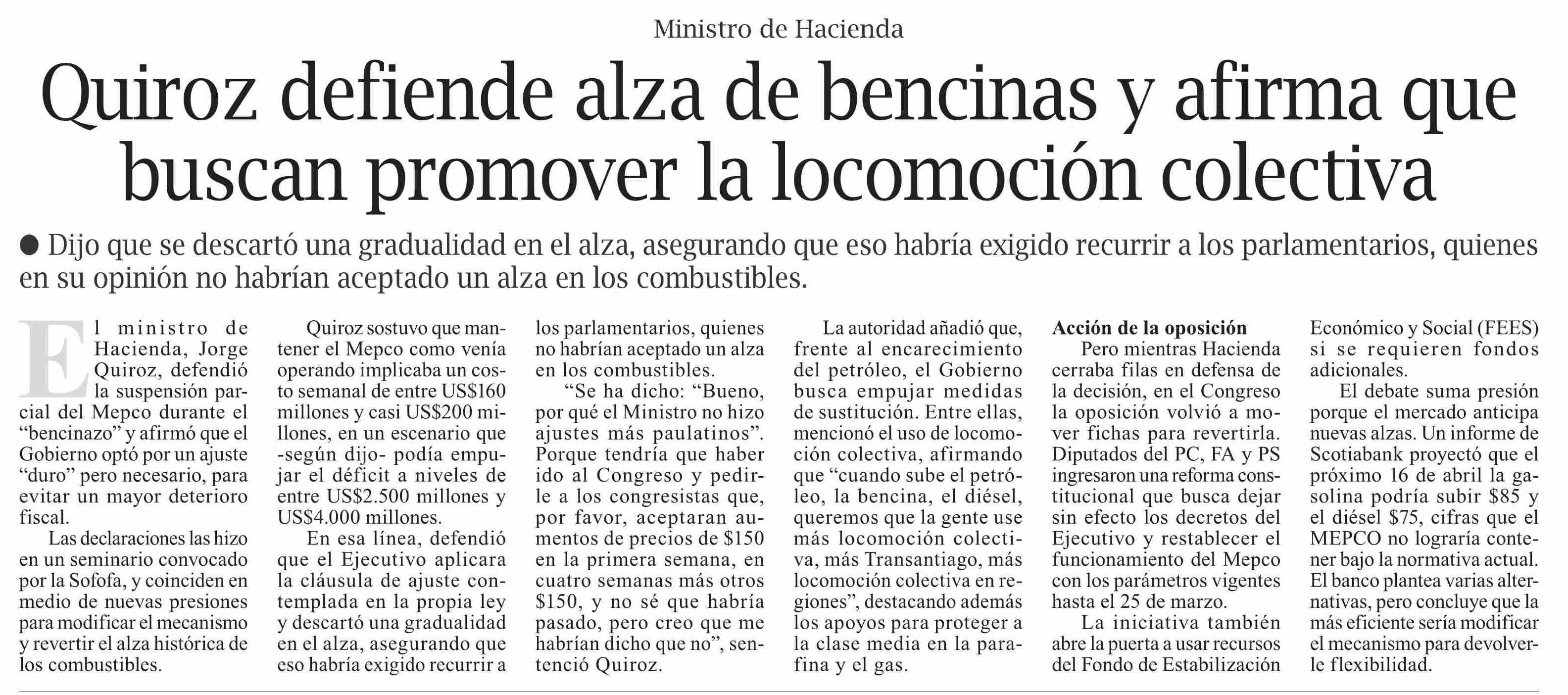 Quiroz defiende alza de bencinas y afirma que buscan promover la locomoción colectiva