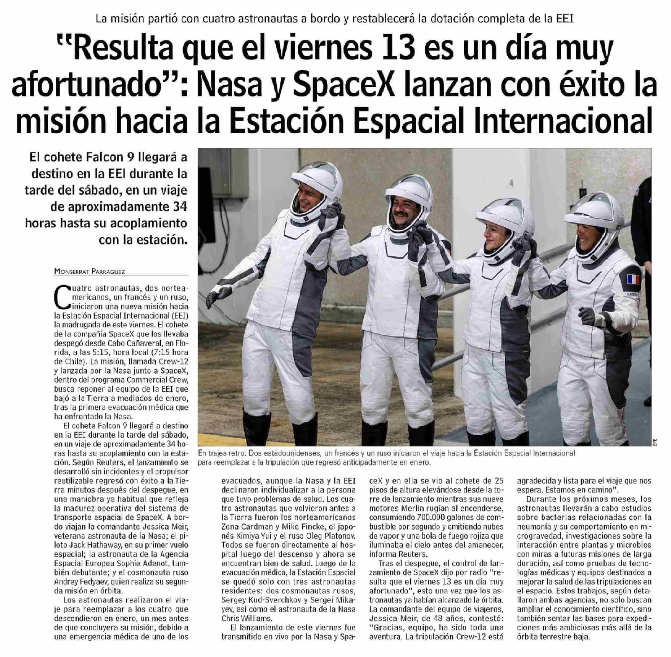 | Título: | "Resulta que el viernes 13 es un día muy afortunado": Nasa y SpaceX lanzan con éxito la misión hacia la Estación Espacial Internacional |