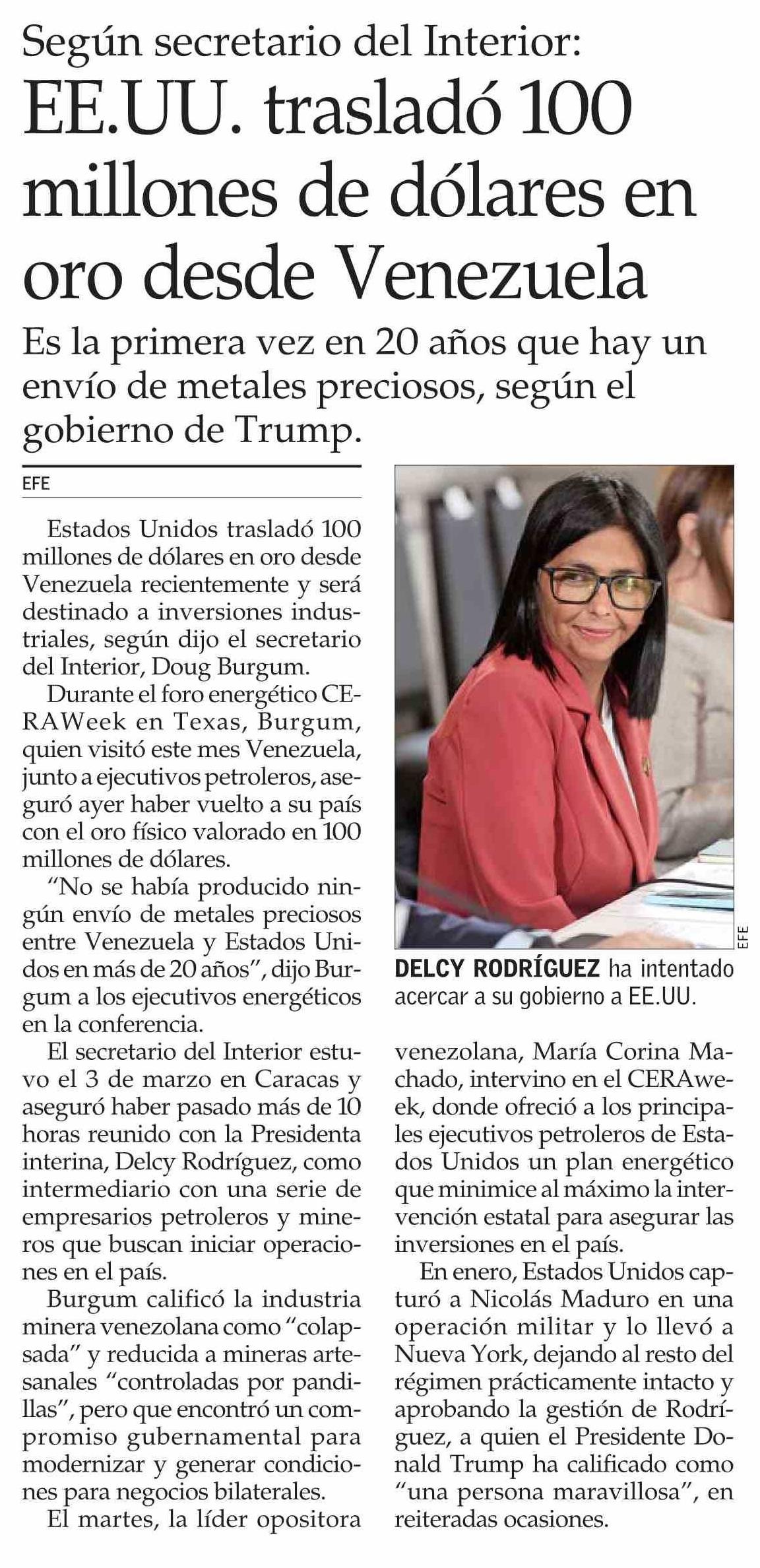 EE.UU. trasladó 100 millones de dólares en oro desde Venezuela