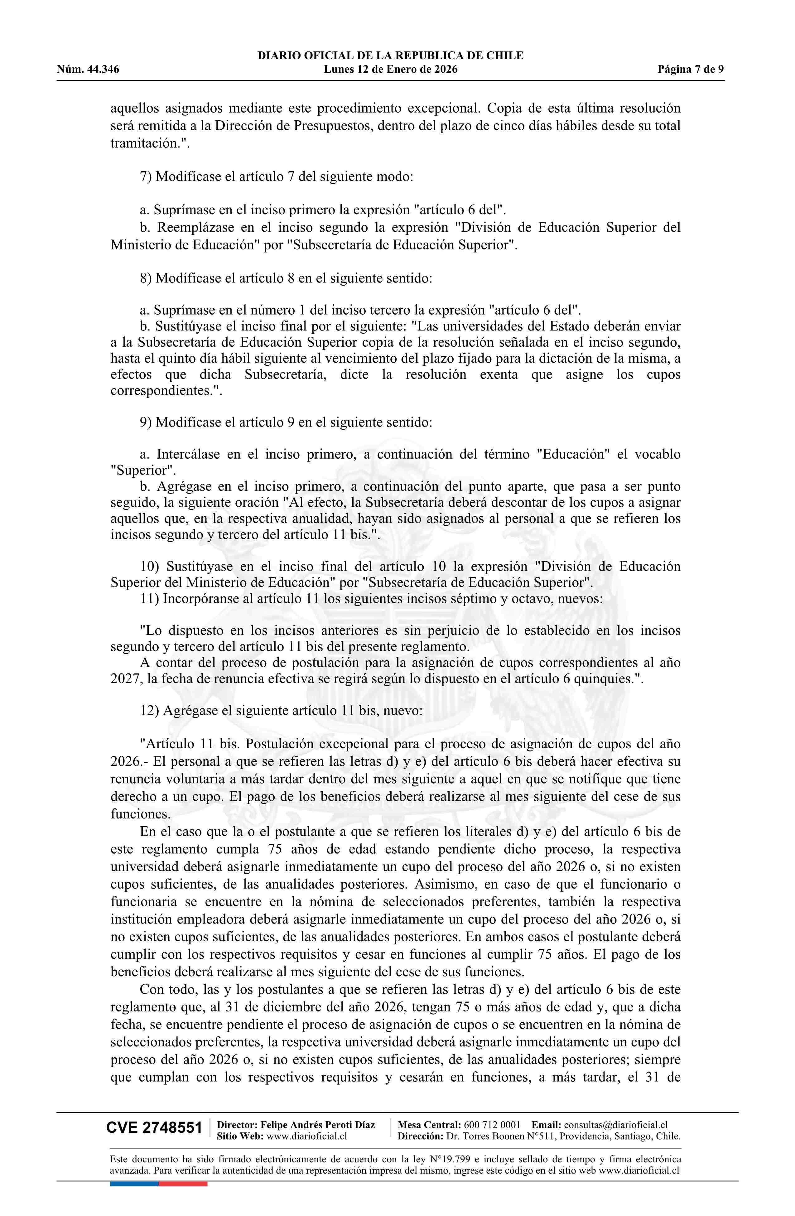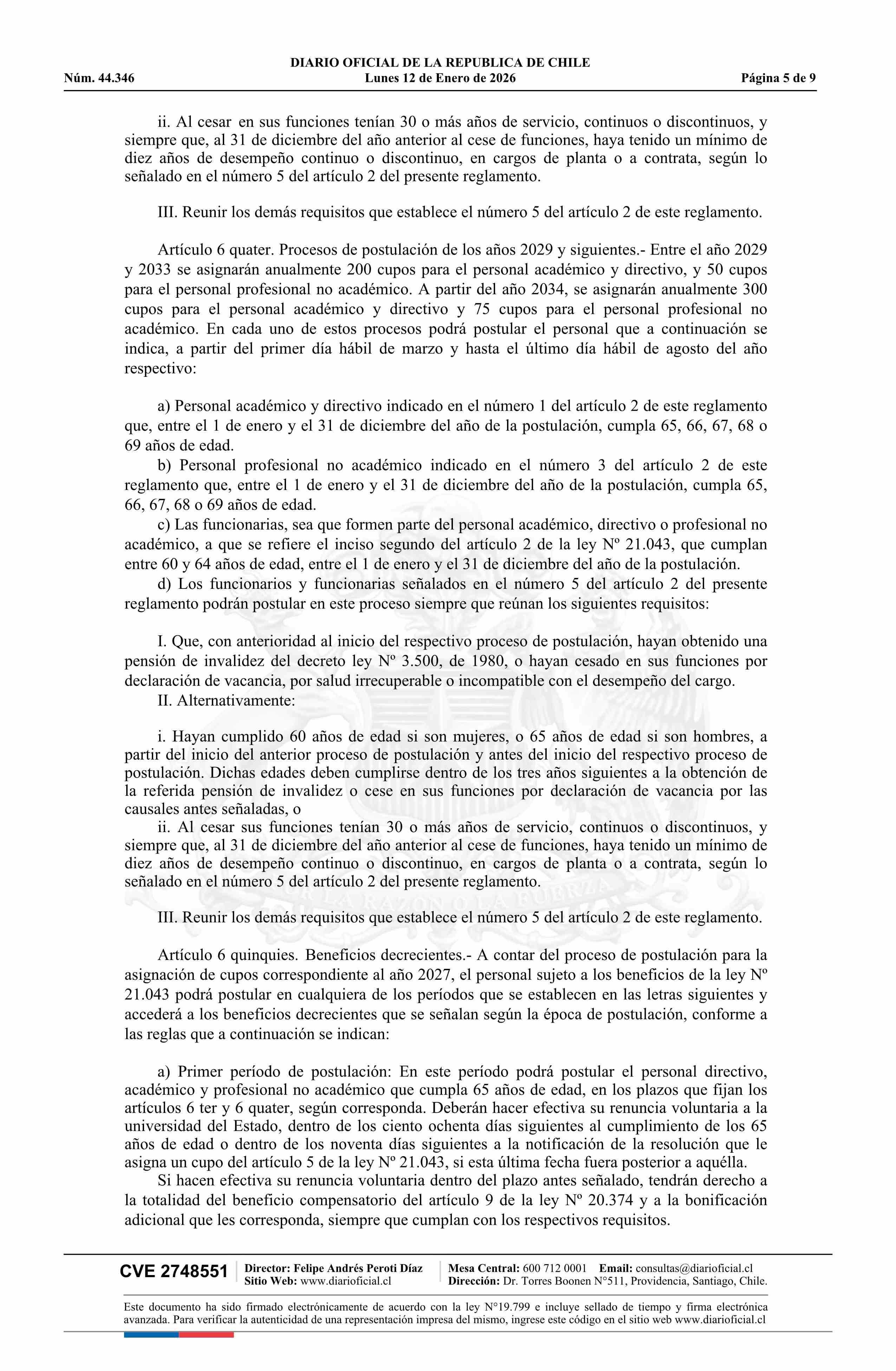| Título: | Decreto número 133, de 2025.- Modifica decreto Nº 47, de 2018, que aprueba Reglamento para el otorgamiento de la bonificación adicional por retiro al personal académico, directivo y profesional no académico de las universidades del Estado y faculta a las mismas para conceder otros beneficios transit |