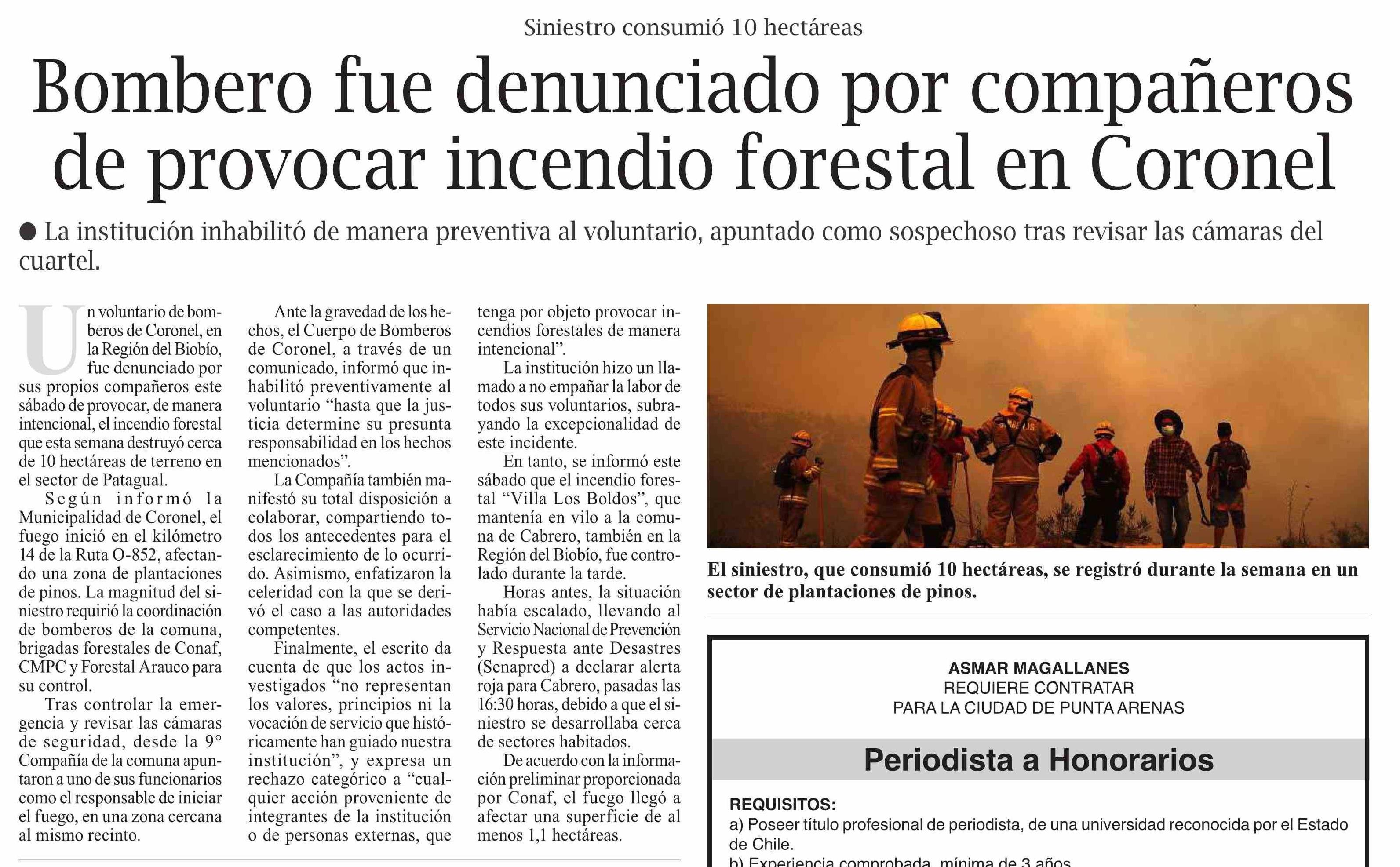 Bombero fue denunciado por compañeros de provocar incendio forestal en Coronel