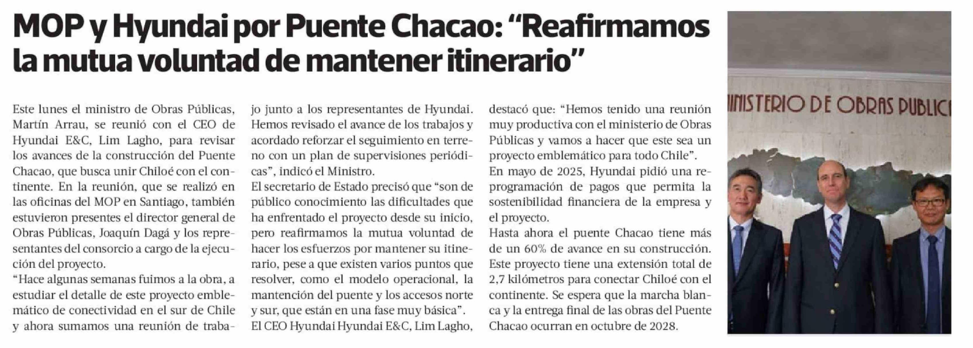 MOP y Hyundai por Puente Chacao: "Reafirmamos la mutua voluntad de mantener itinerario"