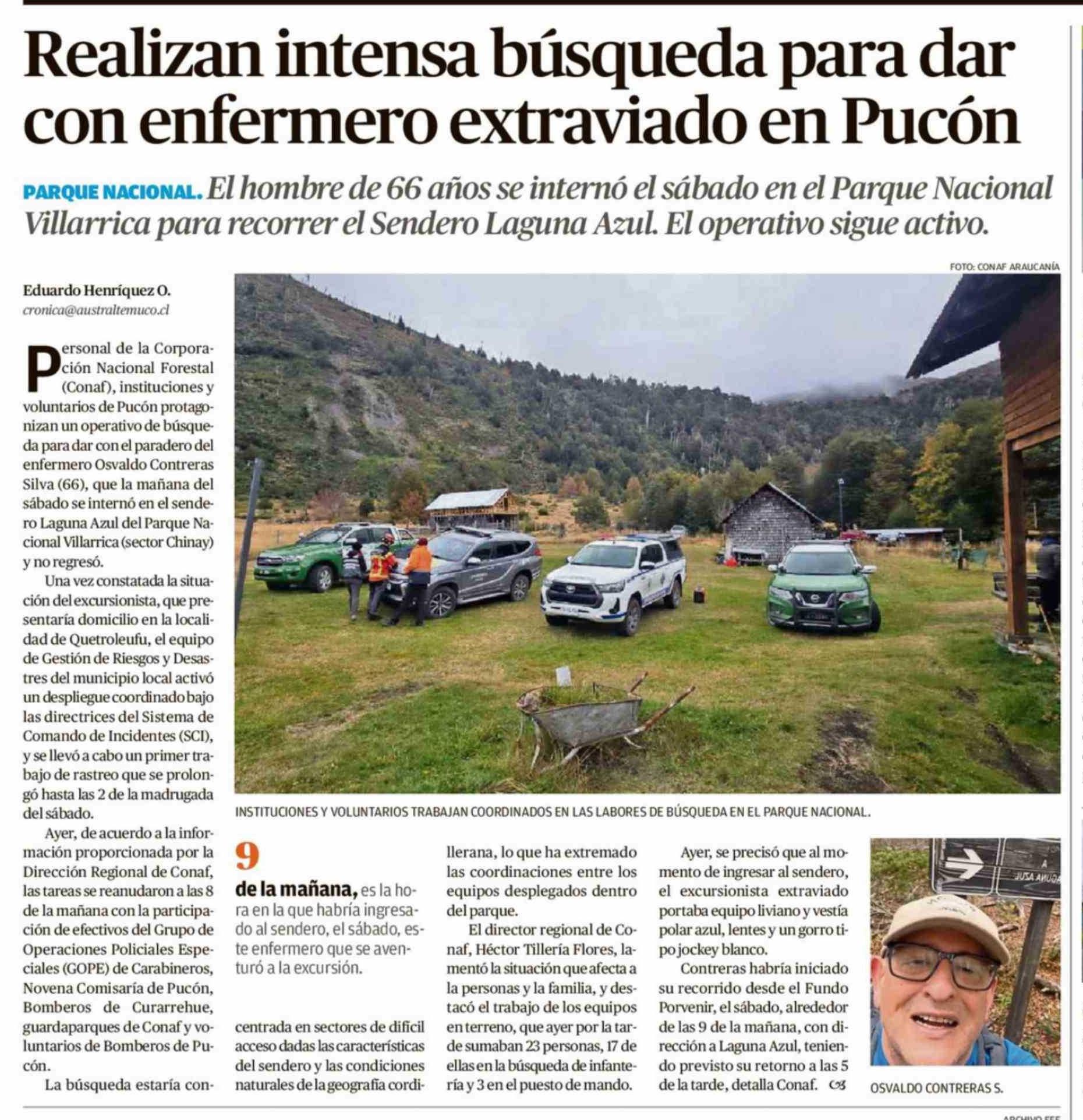 Realizan intensa búsqueda para dar con enfermero extraviado en Pucón