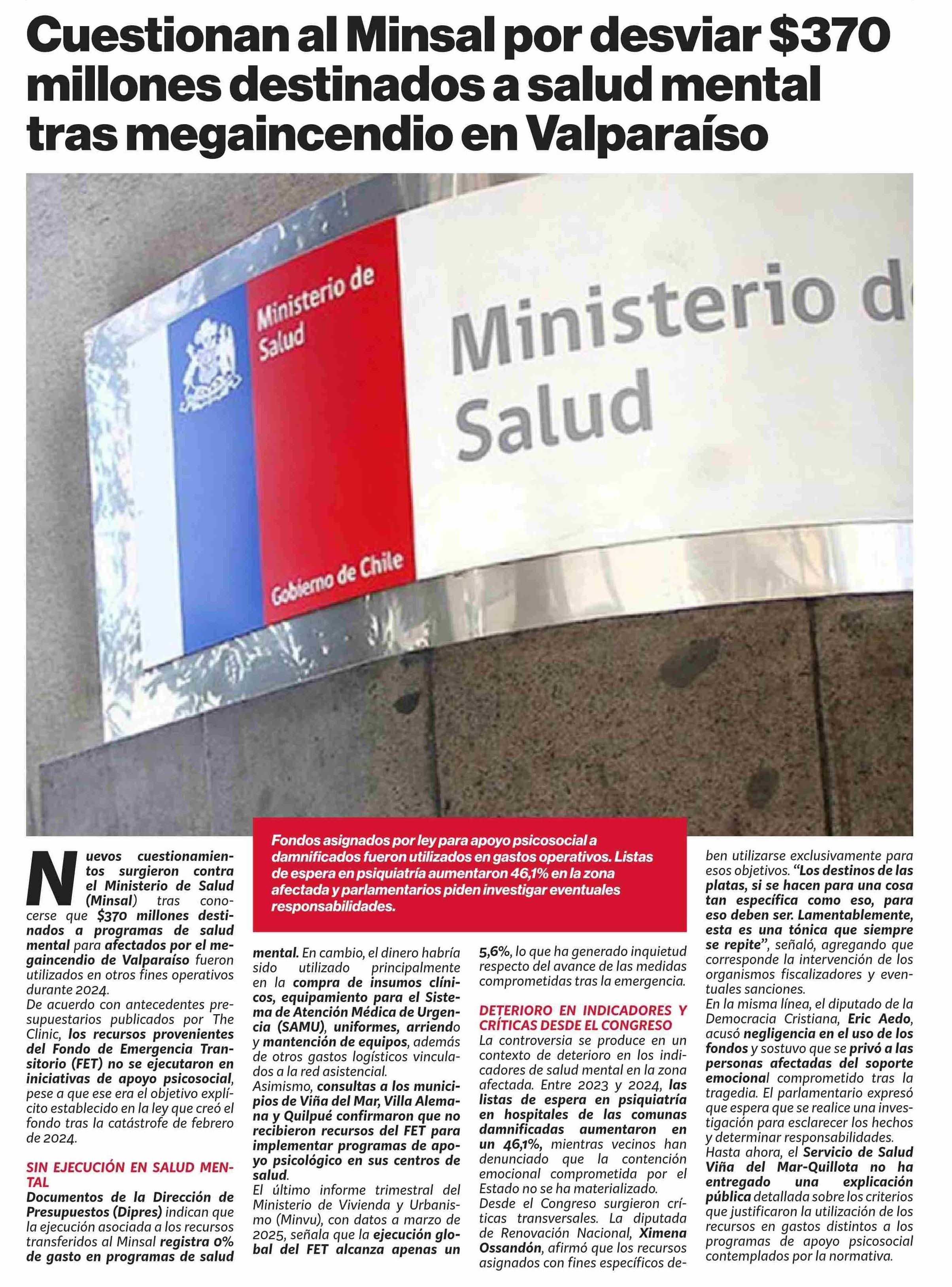 Cuestionan al Minsal por desviar $370 millones destinados a salud mental tras megaincendio en Valparaíso