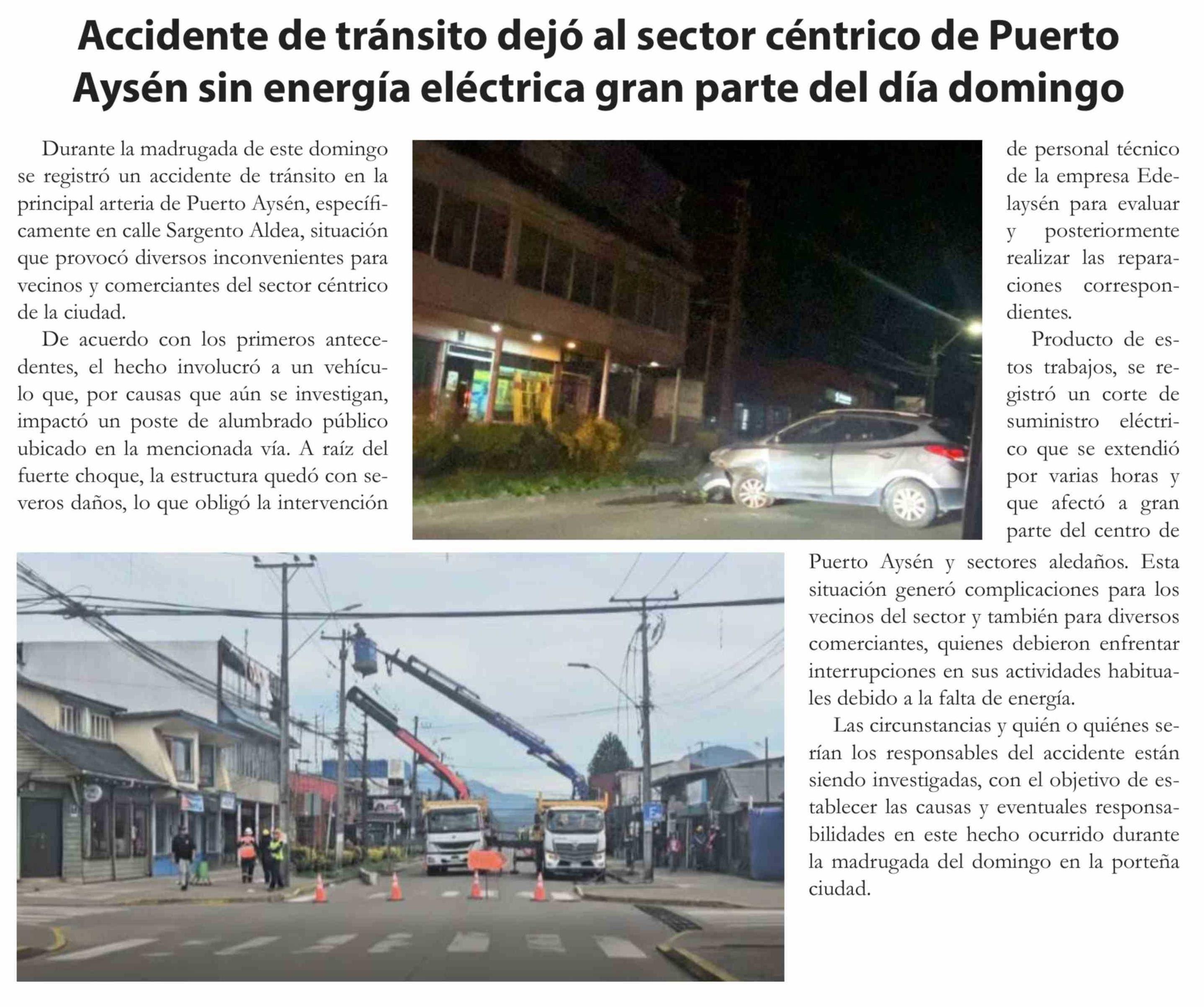 Accidente de tránsito dejó al sector céntrico de Puerto Aysén sin energía eléctrica gran parte del día domingo