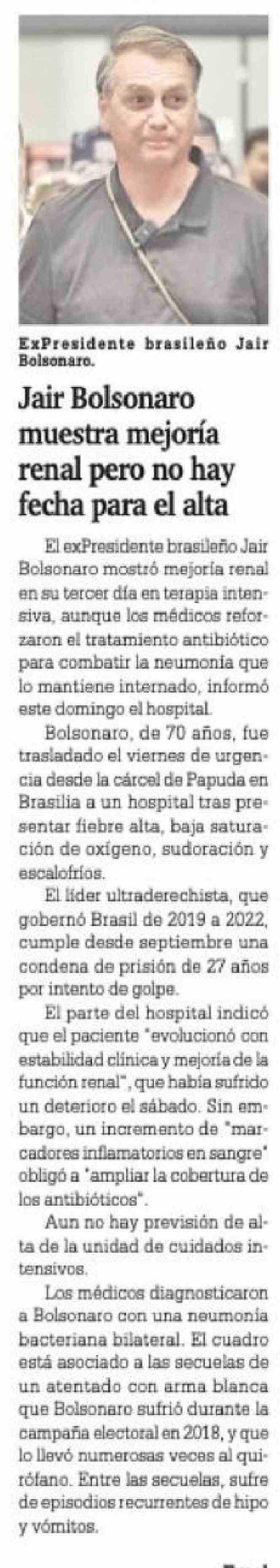 Jair Bolsonaro muestra mejoría renal pero no hay fecha para el alta