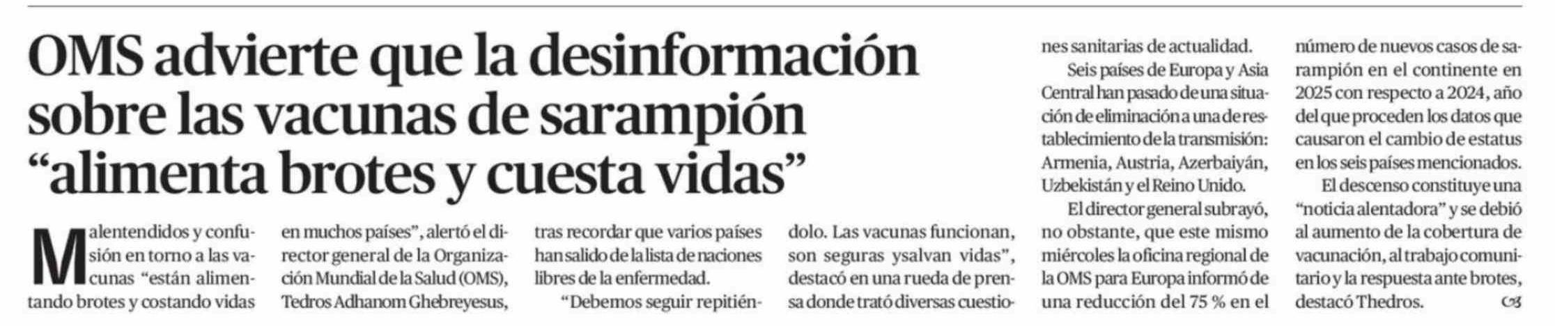 OMS advierte que la desinformación sobre las vacunas de sarampión "alimenta brotes y cuesta vidas"