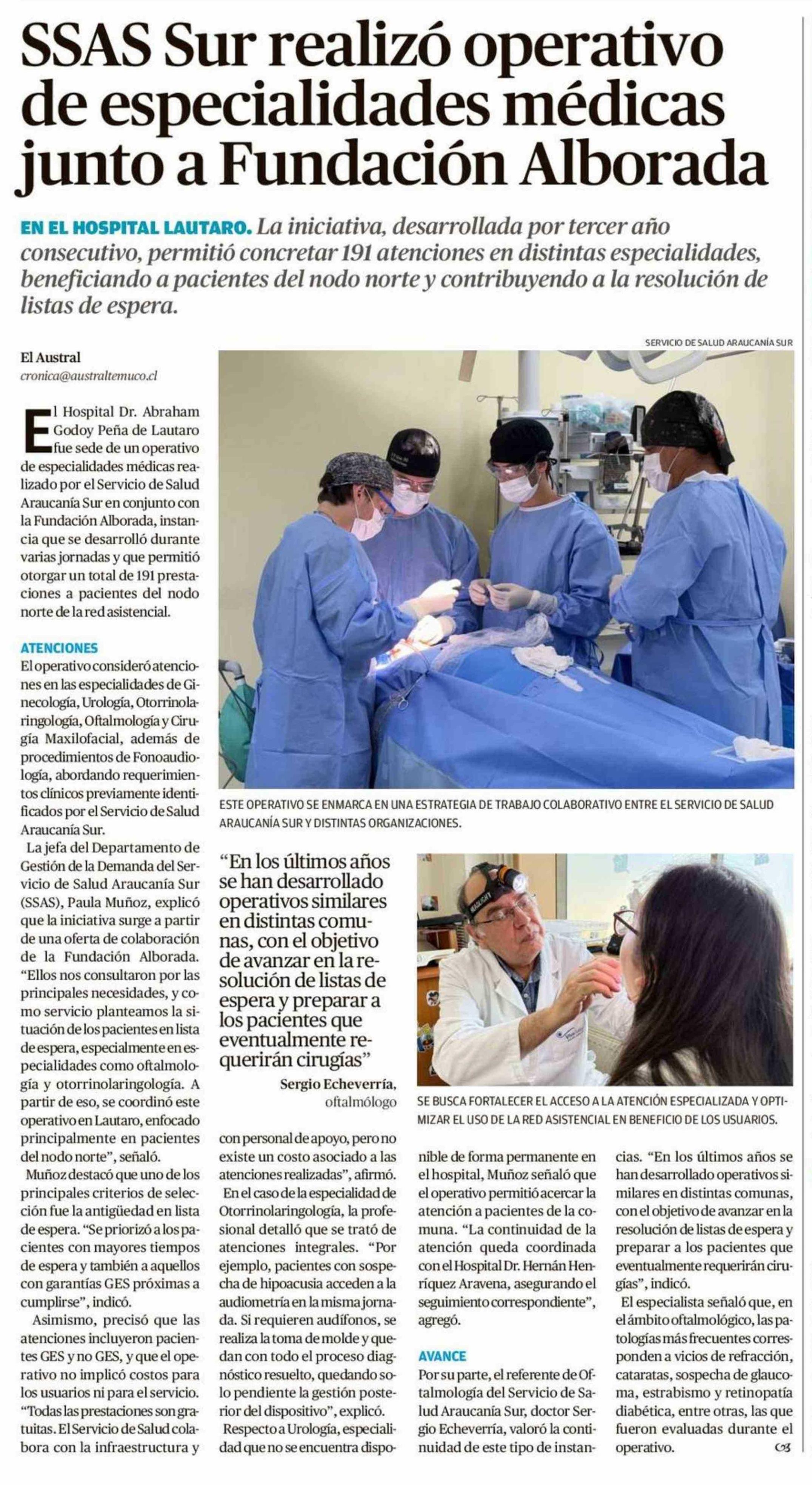 SSAS Sur realizó operativo de especialidades médicas junto a Fundación Alborada