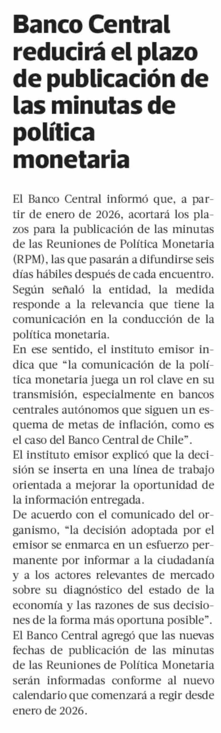 Banco Central reducirá el plazo de publicación de las minutas de política monetaria