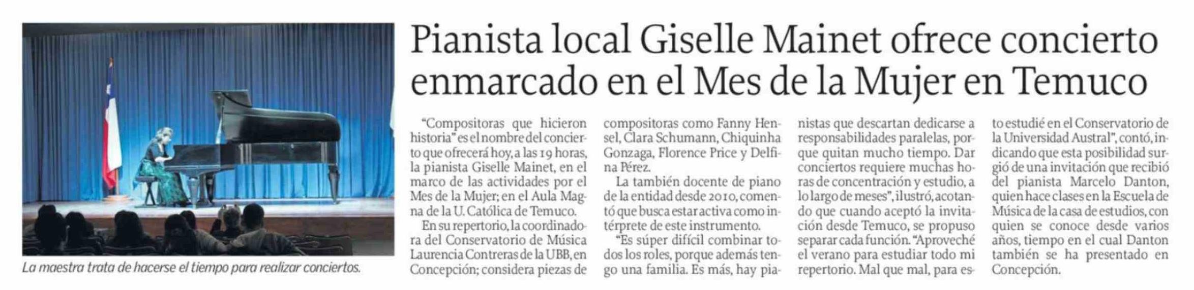 Pianista local Giselle Mainet ofrece concierto enmarcado en el Mes de la Mujer en Temuco