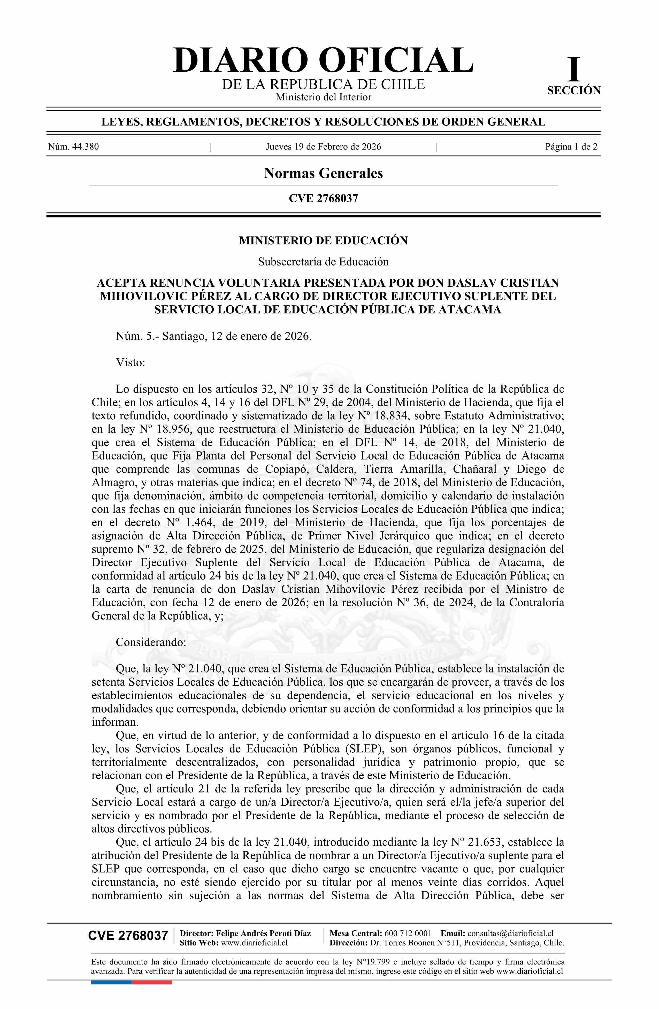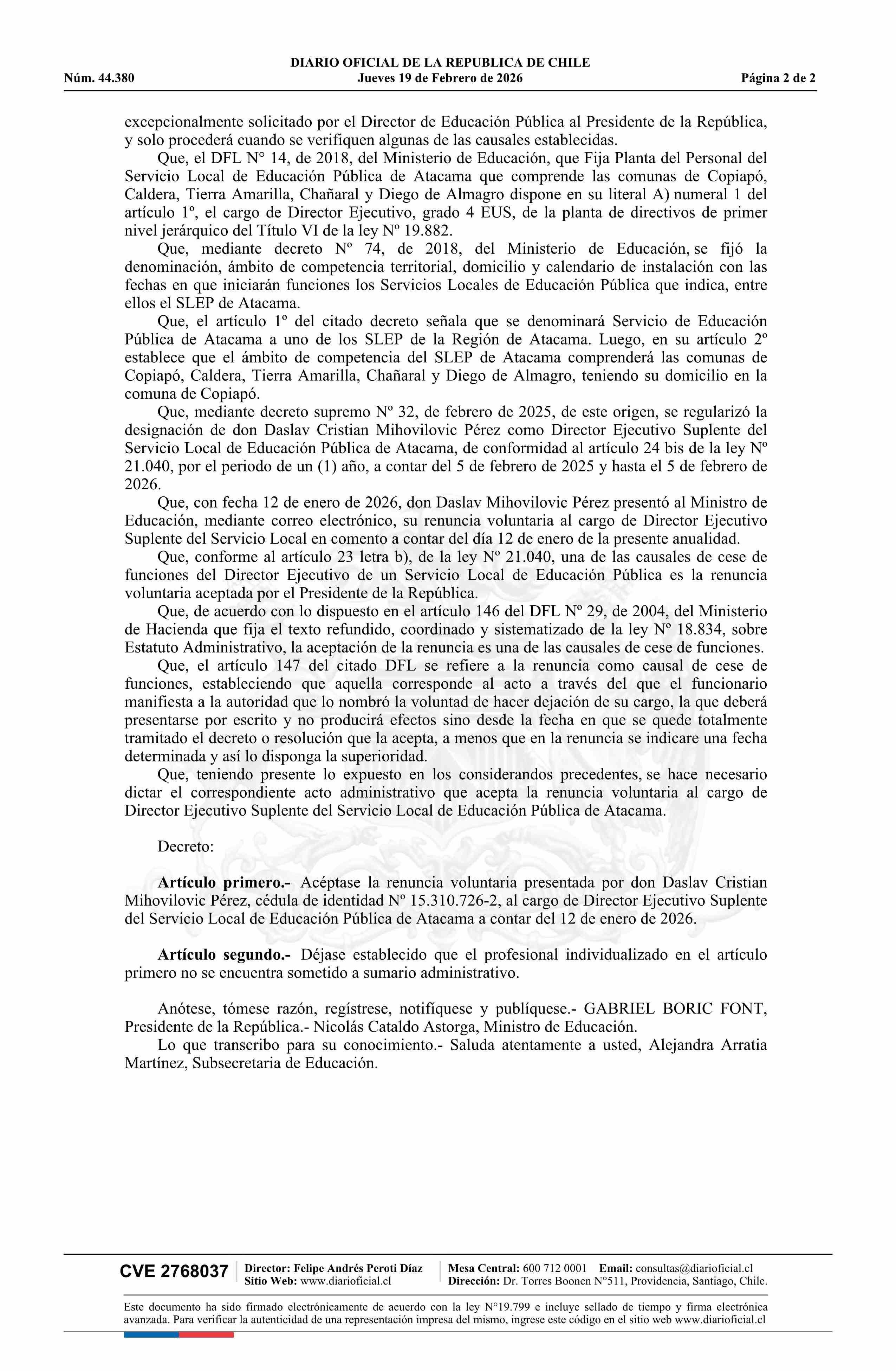 | Título: | Decreto número 5, de 2026.- Acepta renuncia voluntaria presentada por don Daslav Cristian Mihovilovic Pérez al cargo de Director Ejecutivo Suplente del Servicio Local de Educación Pública de Atacama |