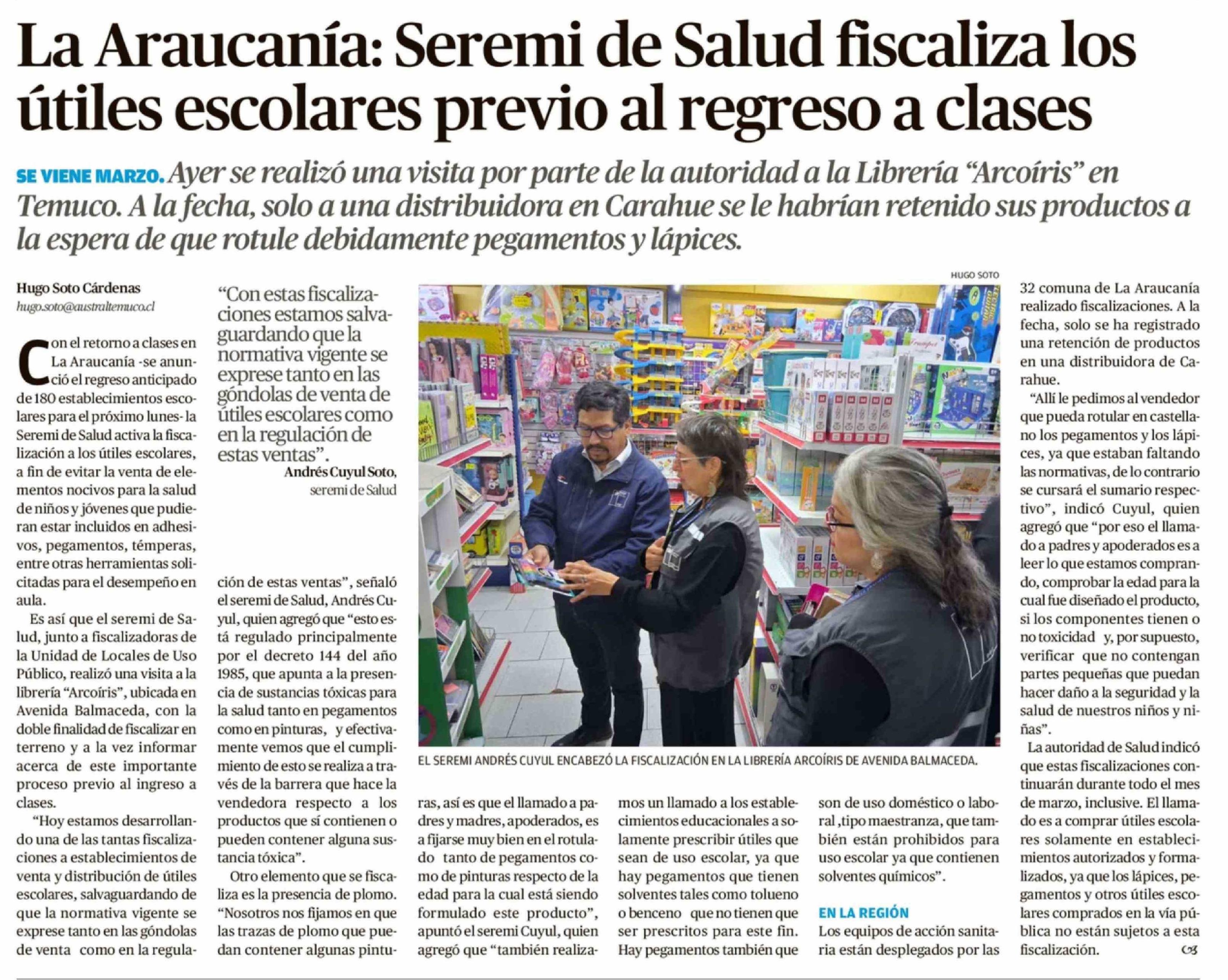 La Araucanía: Seremi de Salud fiscaliza los útiles escolares previo al regreso a clases