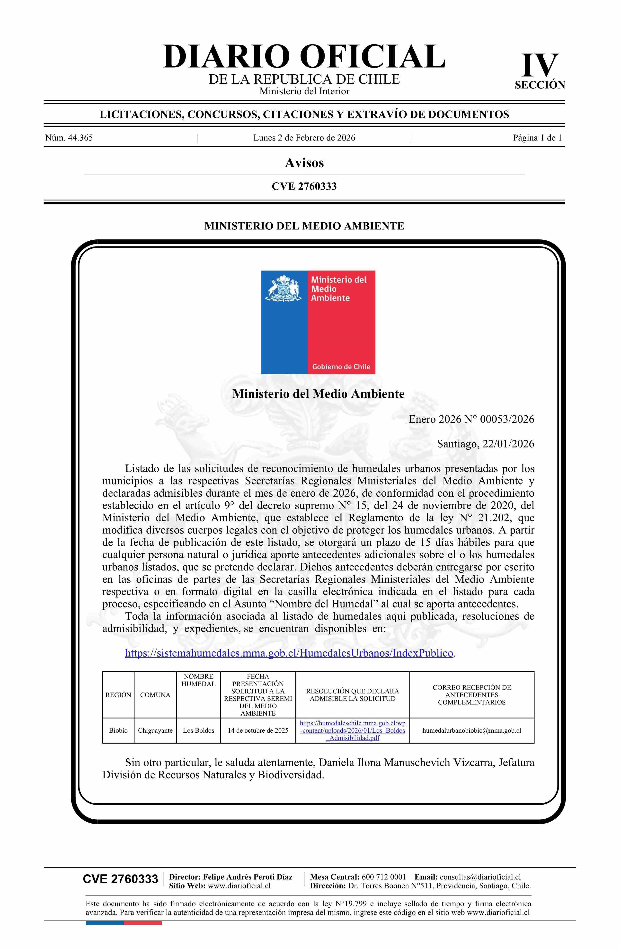 AVISO LICITACIONES: Listado de solicitudes de reconocimiento de humedales urbanos