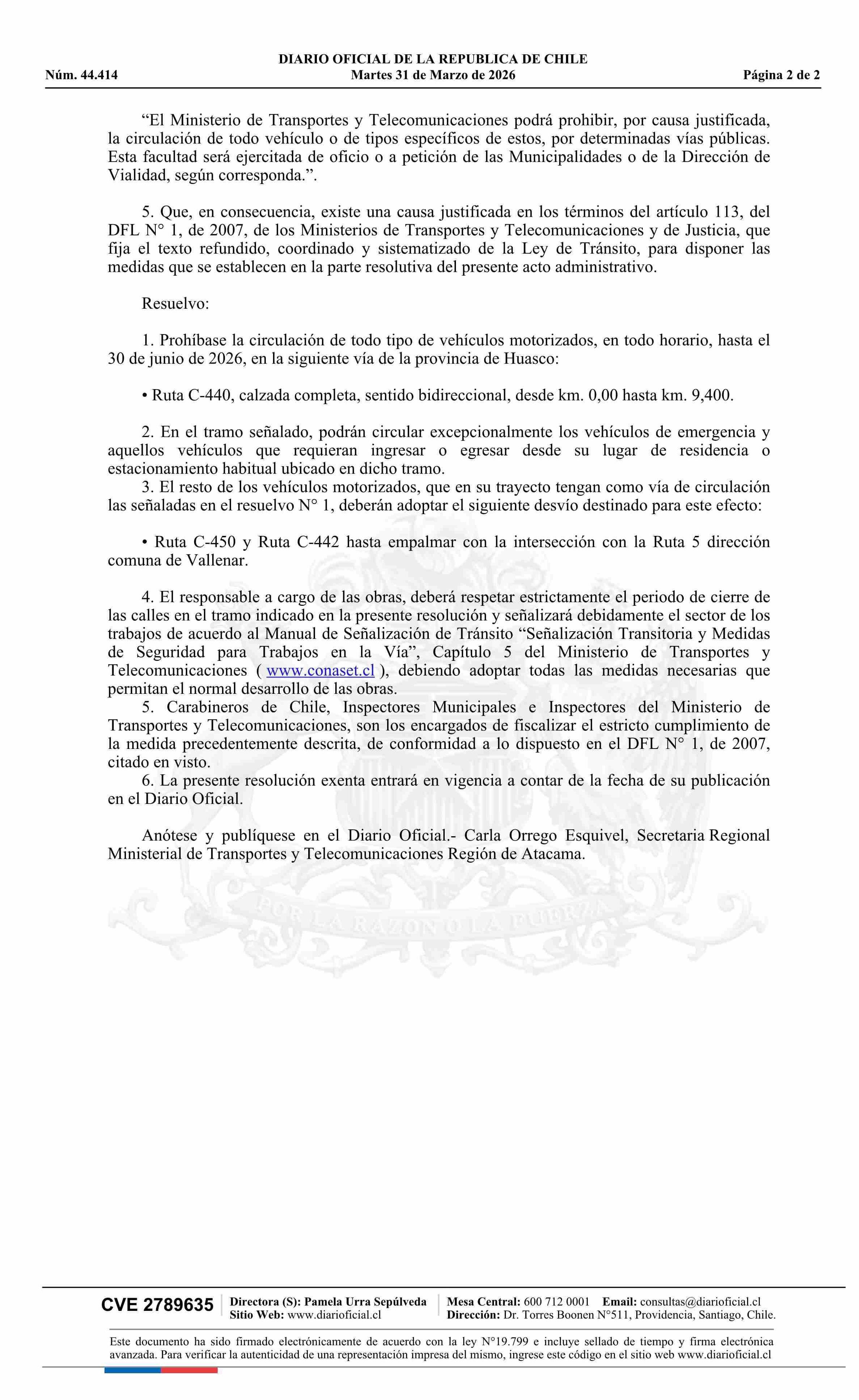 Título: MINISTERIO DE TRANSPORTES Y TELECOMUNICACIONES Secretaría Regional Ministerial Región de Atacama PROHÍBE CIRCULACIÓN DE VEHÍCULOS MOTORIZADOS EN TRAMO DE LA VIA QUE INDICA, DE LA PROVINCIA DE HUASCO, REGIÓN DE ATACAMA