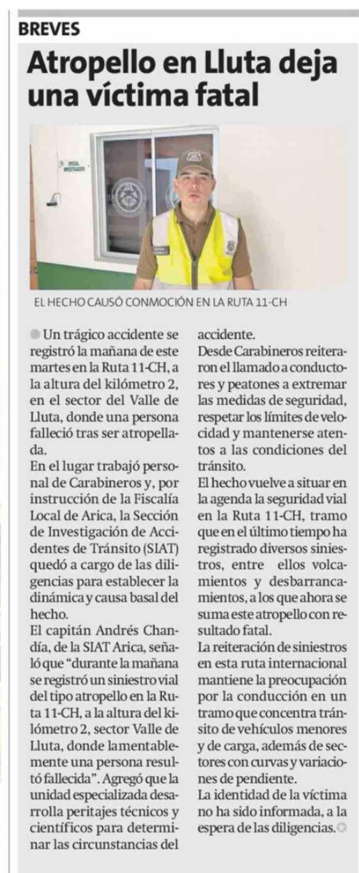 Atropello en Lluta deja una víctima fatal