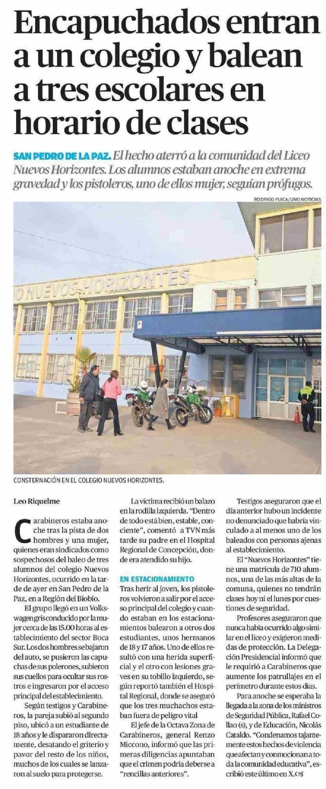 Encapuchados entran a un colegio y balean a tres escolares en horario de clases
