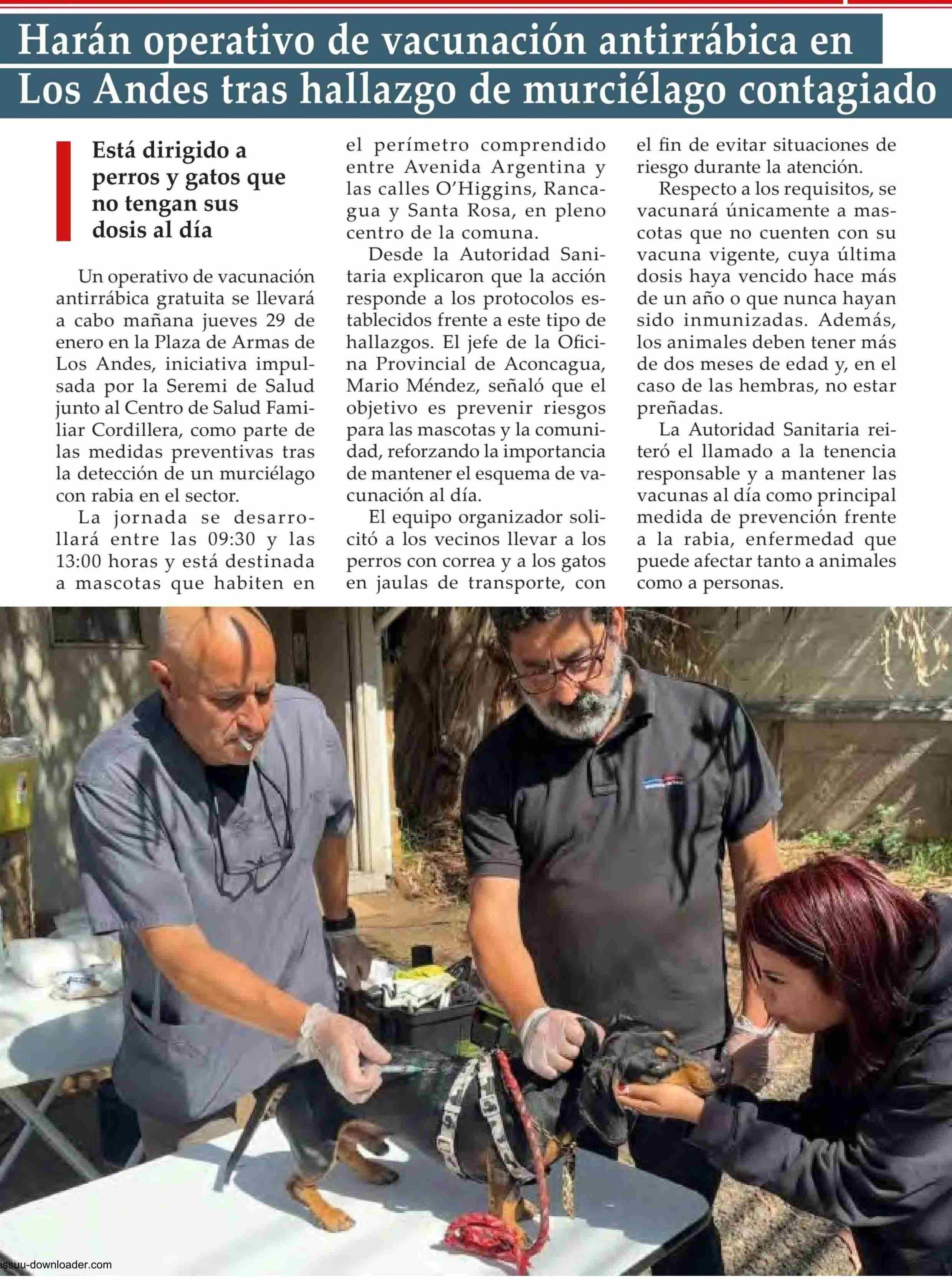 Título: Harán operativo de vacunación antirrábica en Los Andes tras hallazgo de murciélago contagiado