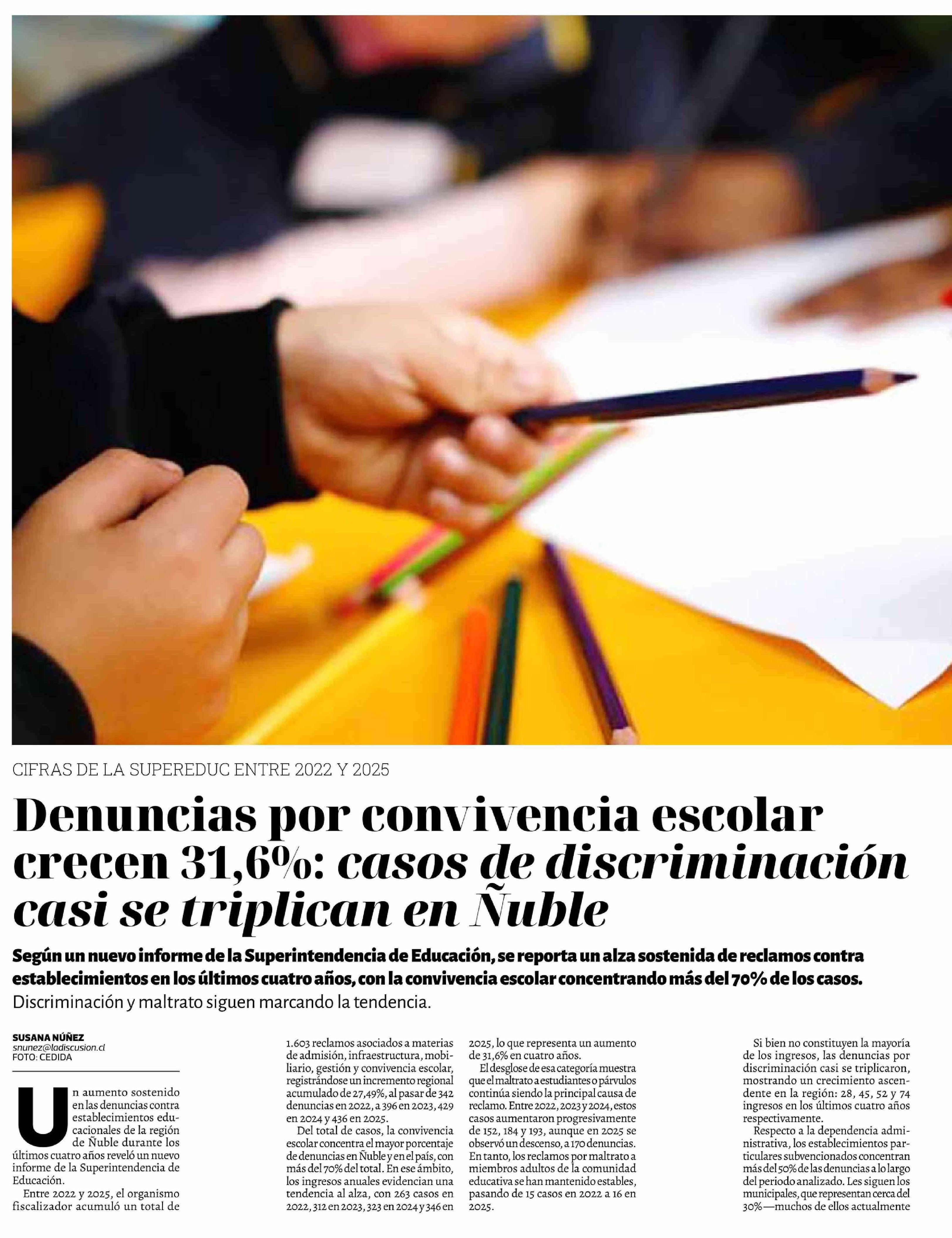 Denuncias por convivencia escolar crecen 31,6%: casos de discriminación casi se triplican en Ñuble