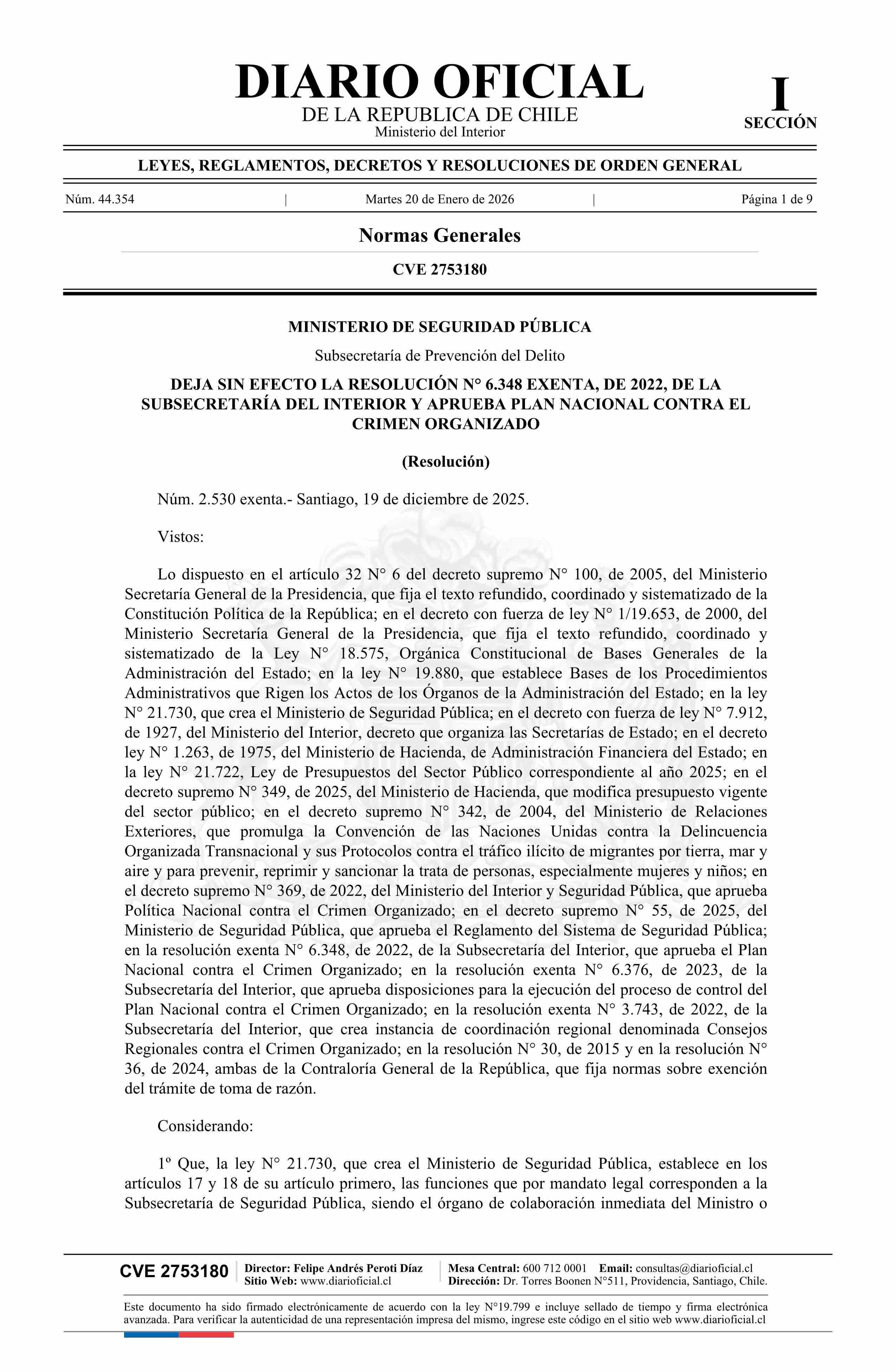 | Título: | Resolución exenta número 2.530, de 2025.- Deja sin efecto resolución N° 6.348 exenta, de 2022, de la Subsecretaría del Interior, y aprueba Plan Nacional contra el Crimen Organizado |