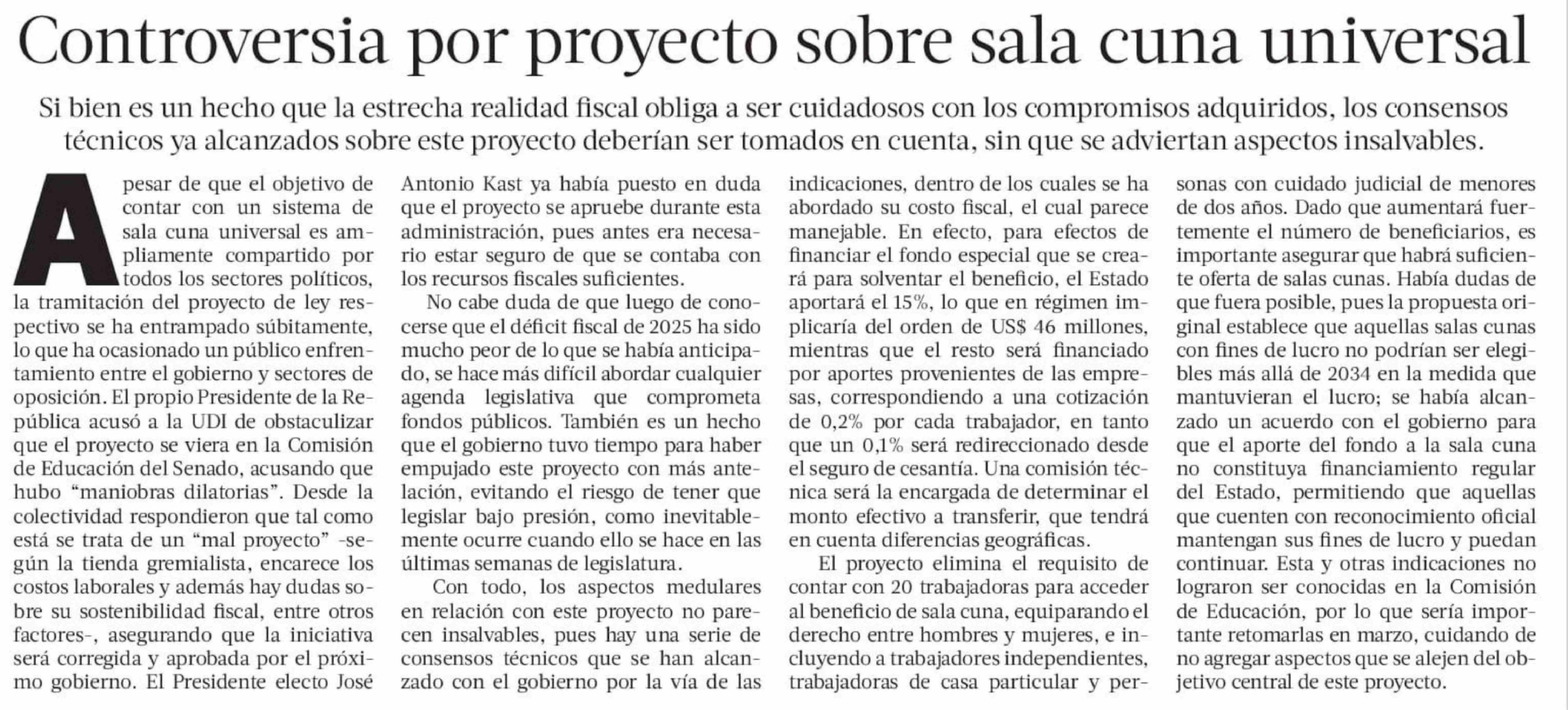 Editorial: Controversia por proyecto sobre sala cuna universal