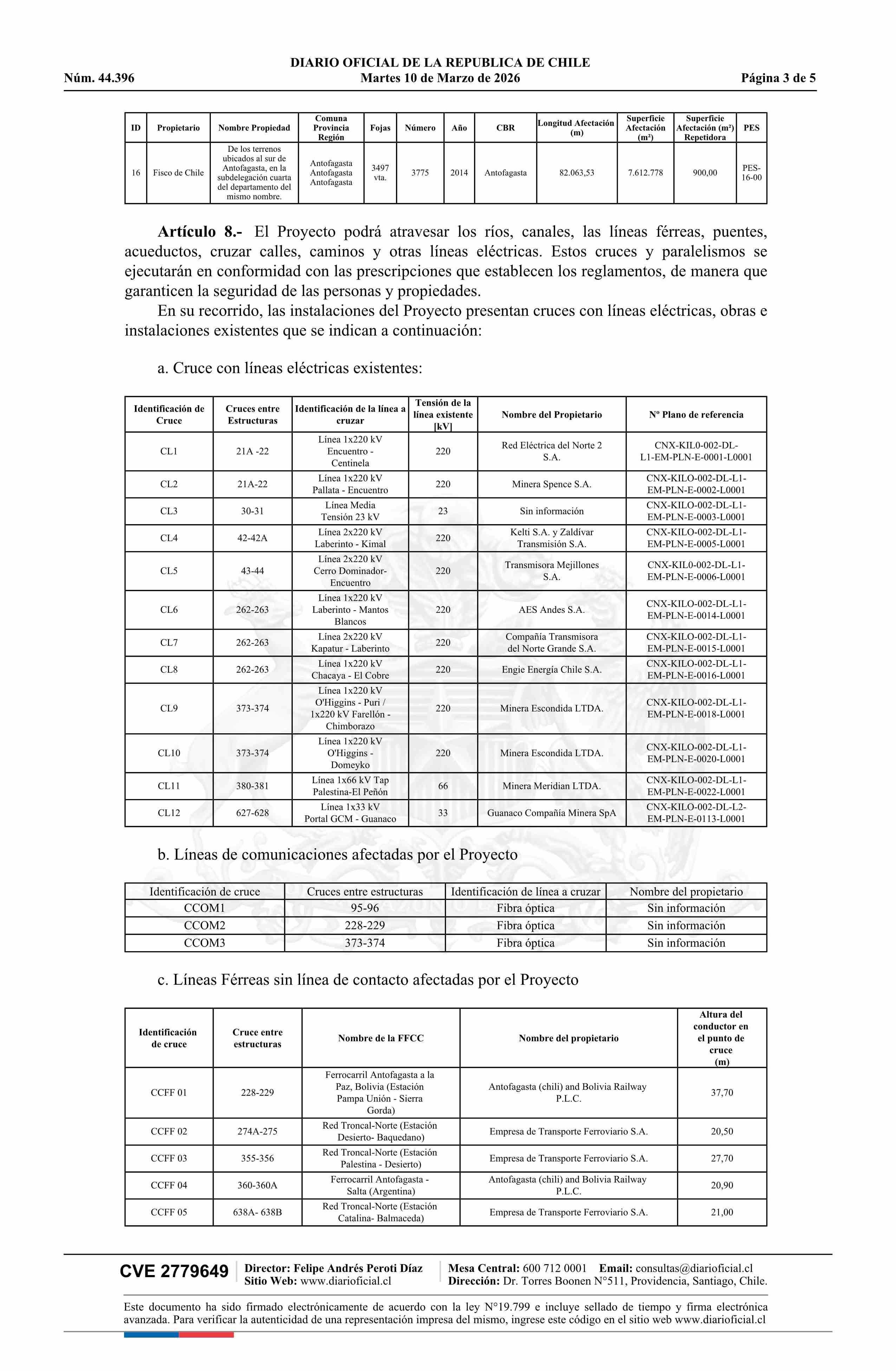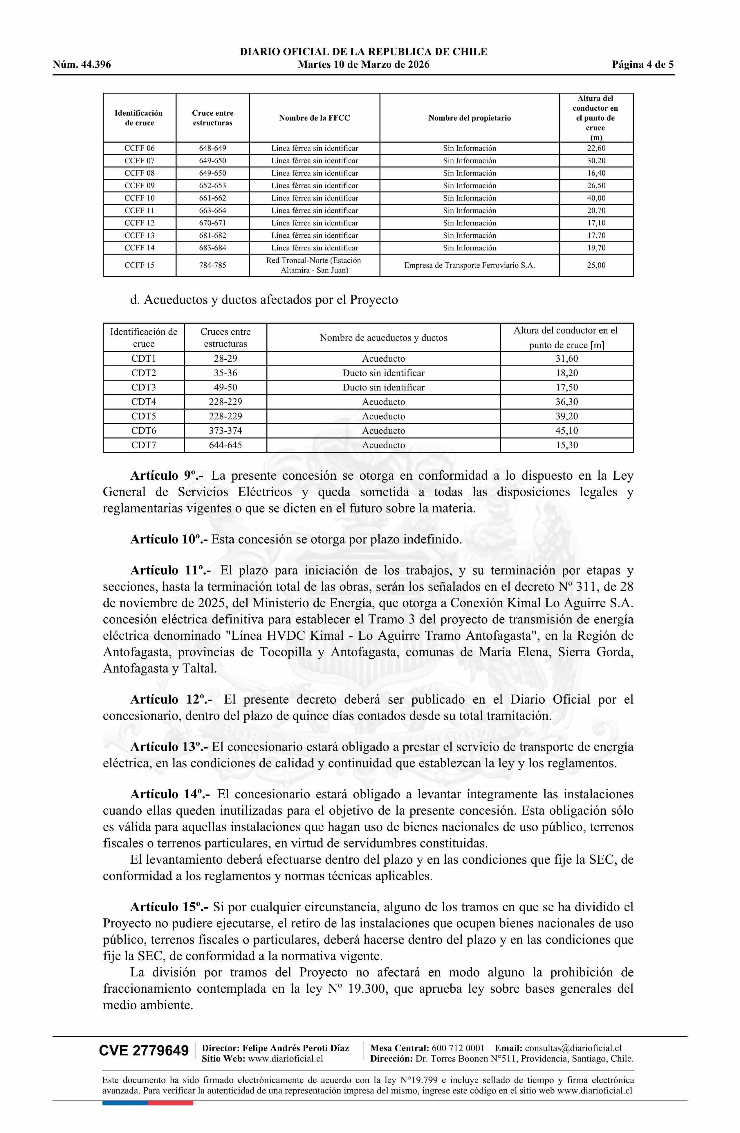 Título: Decreto exento número 57, de 2026.- Otorga a Conexión Kimal Lo Aguirre S.A. concesión eléctrica definitiva para establecer el Tramo 2 del proyecto de transmisión de energía eléctrica denominado Línea HVDC Kimal - Lo Aguirre Tramo Antofagasta, en la Región de Antofagasta, provincias de Tocopilla y An