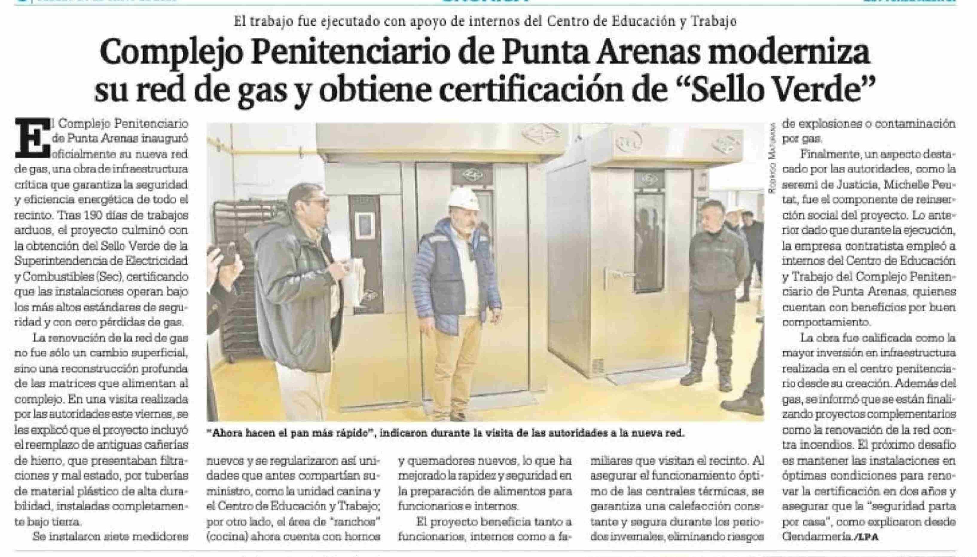 Complejo Penitenciario de Punta Arenas moderniza su red de gas y obtiene certificación de "Sello Verde"