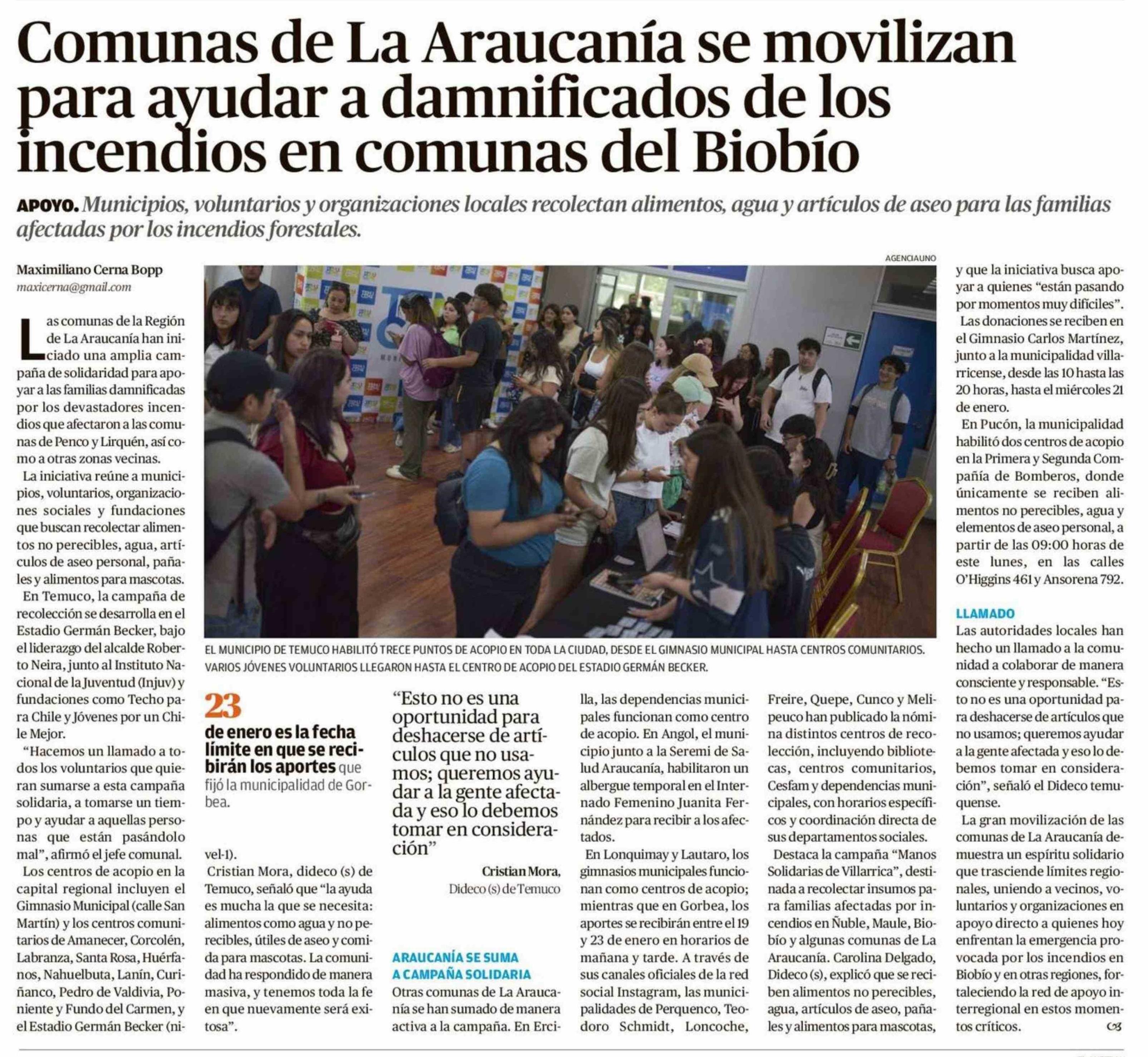 Comunas de La Araucanía se movilizan para ayudar a damnificados de los incendios en comunas del Biobío
