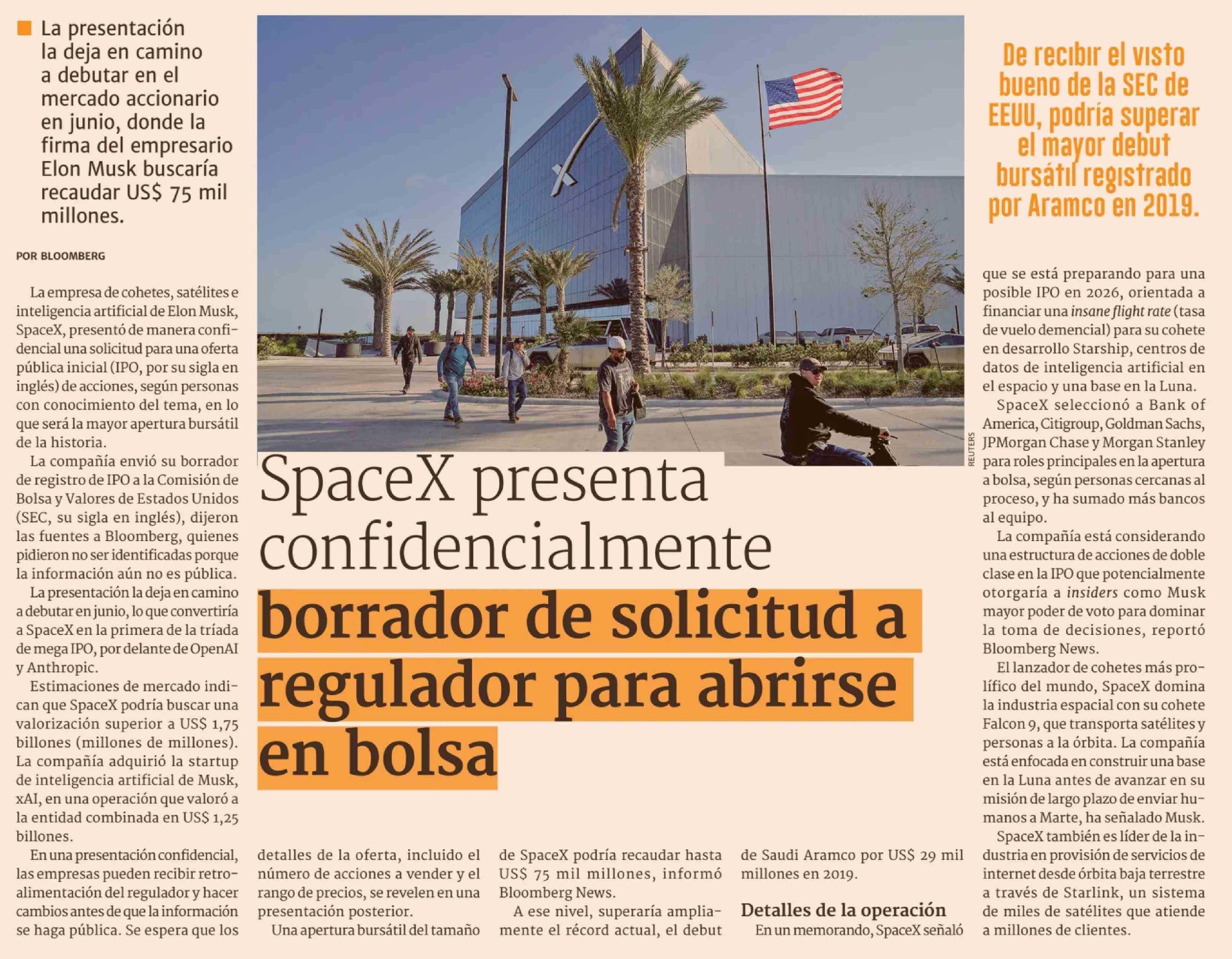 SpaceX presenta confidencialmente borrador de solicitud a regulador para abrirse en bolsa