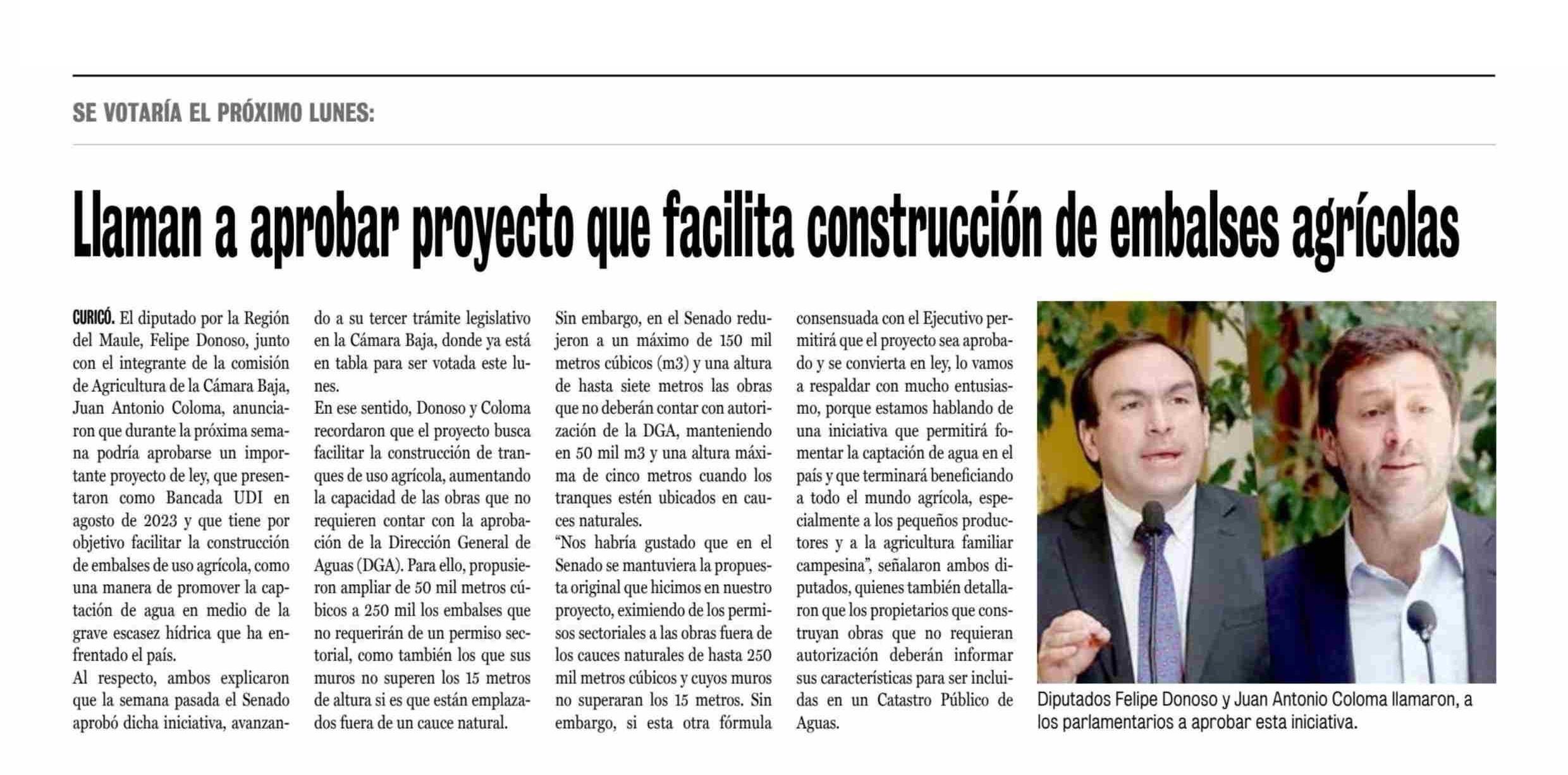 llaman a aprobar proyecto que facilita construcción de embalses agrícolas