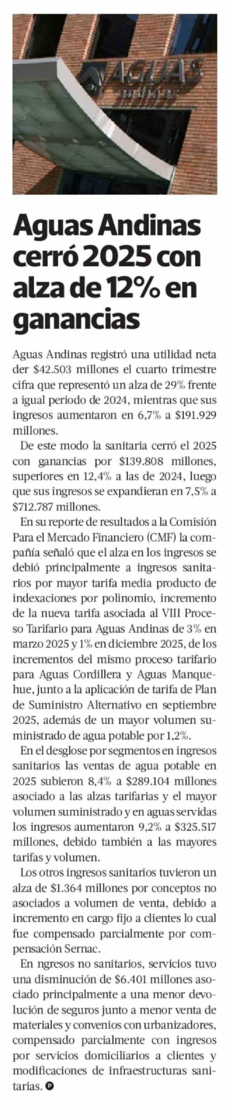 Título: Aguas Andinas cerró 2025 con alza de 12% en ganancias