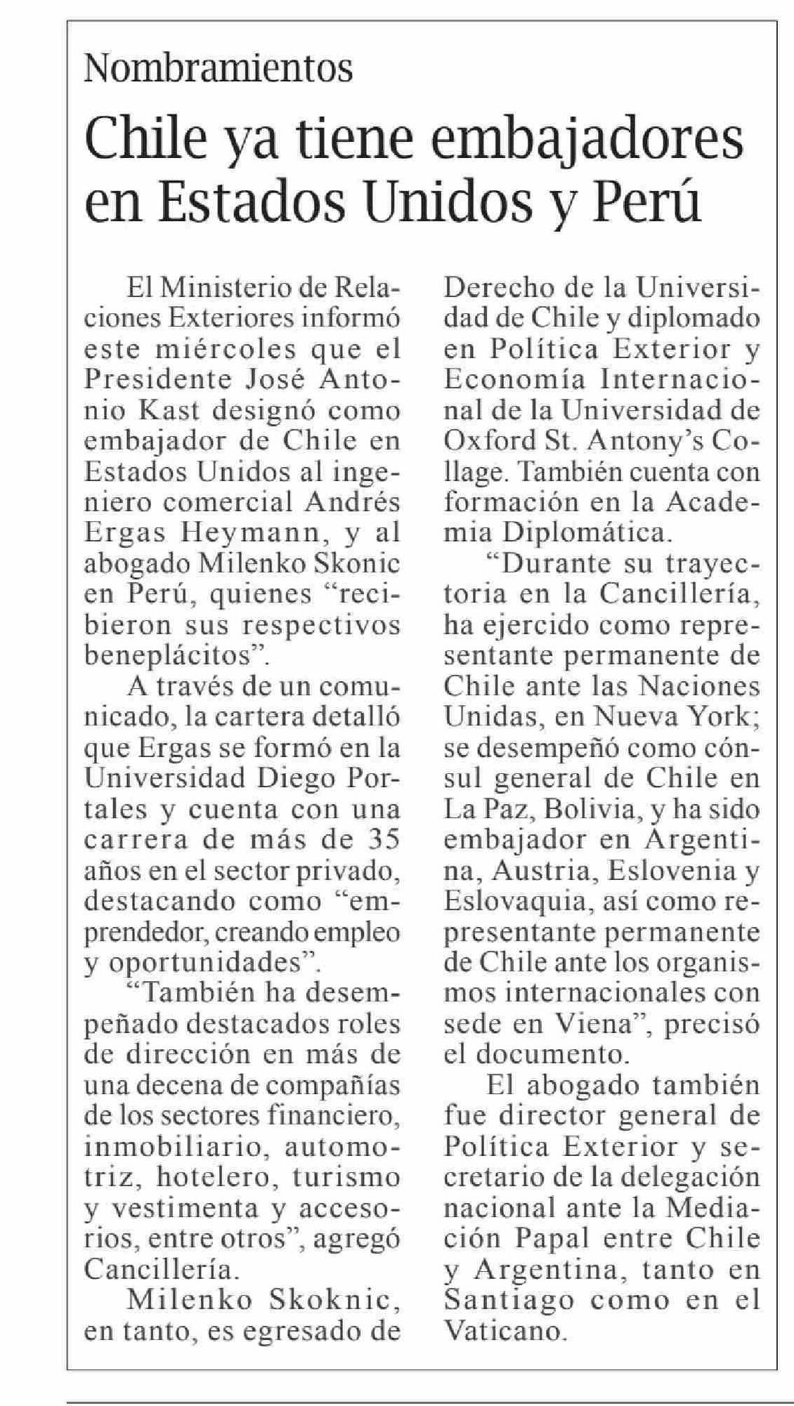 Chile ya tiene embajadores en Estados Unidos y Perú