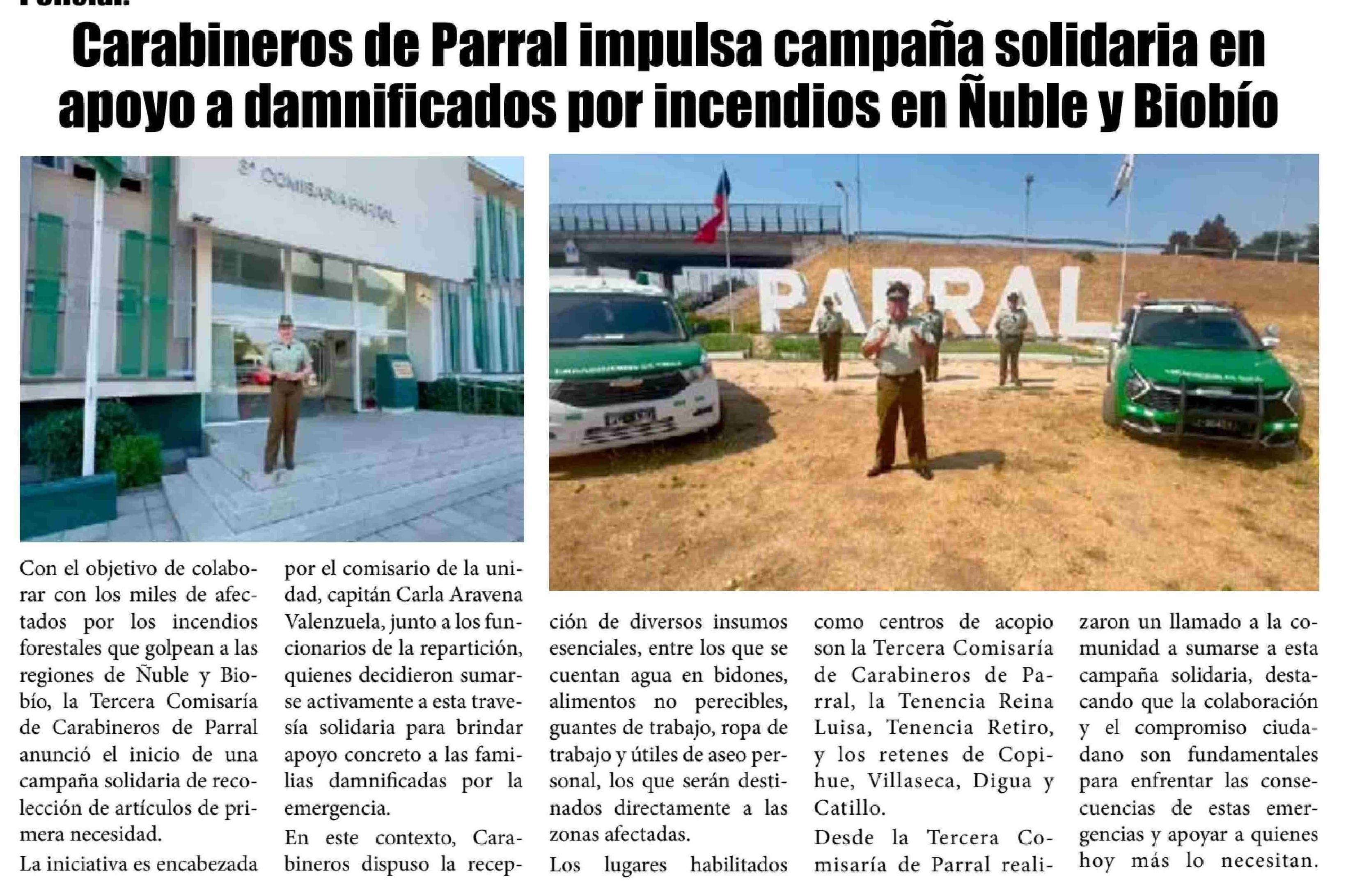 Carabineros de Parral impulsa campaña solidaria en apoyo a damnificados por incendios en Nuble y Biobio