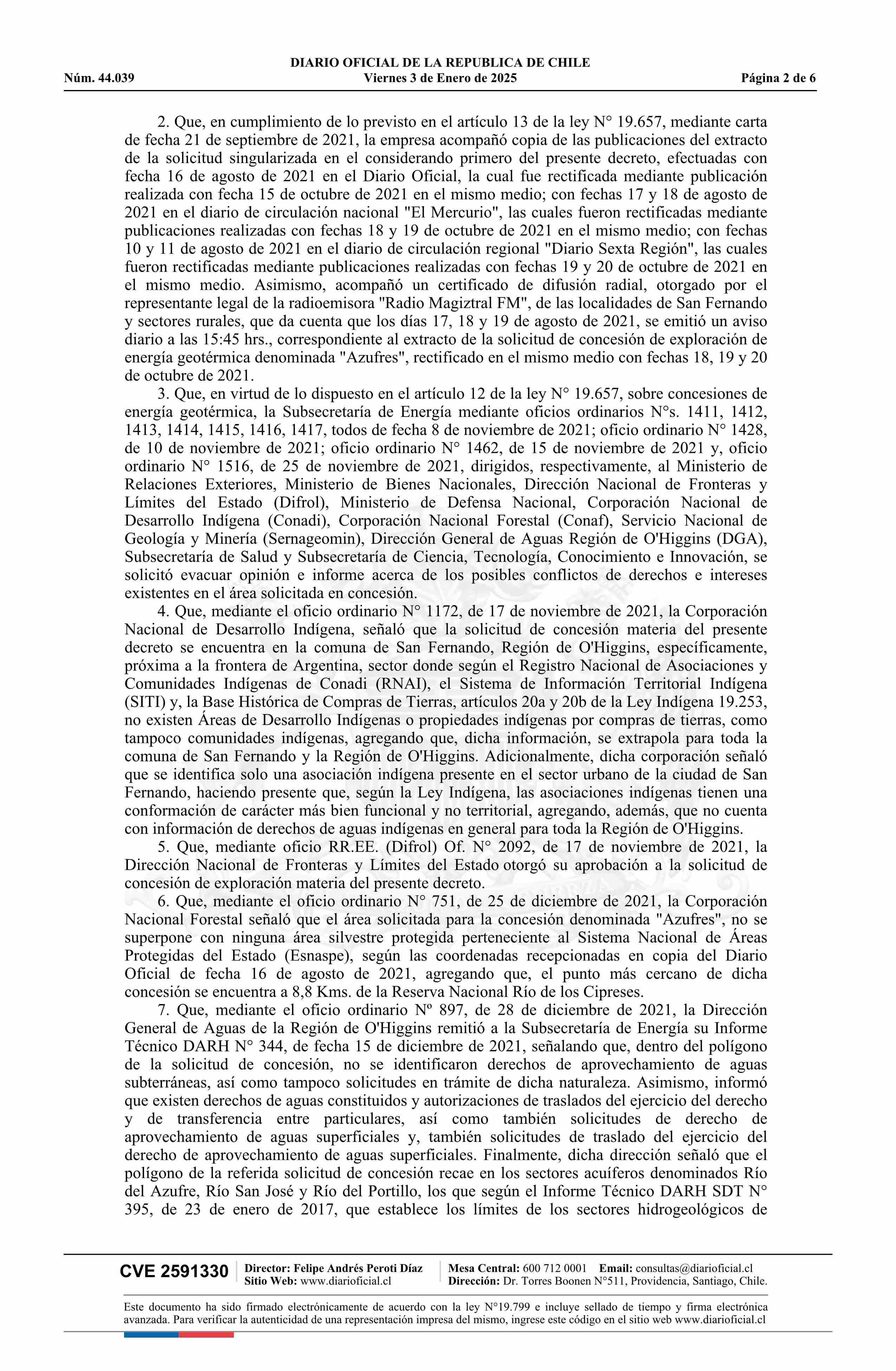 | Título: | Decreto número 3, de 2023.- Otorga a la empresa Transmark Chile SpA, concesión de exploración de energía geotérmica denominada Azufres, ubicada en la Región del Libertador General Bernardo O'Higgins, provincia de Colchagua, comuna de San Fernando, en virtud de la ley N° 19.657 |