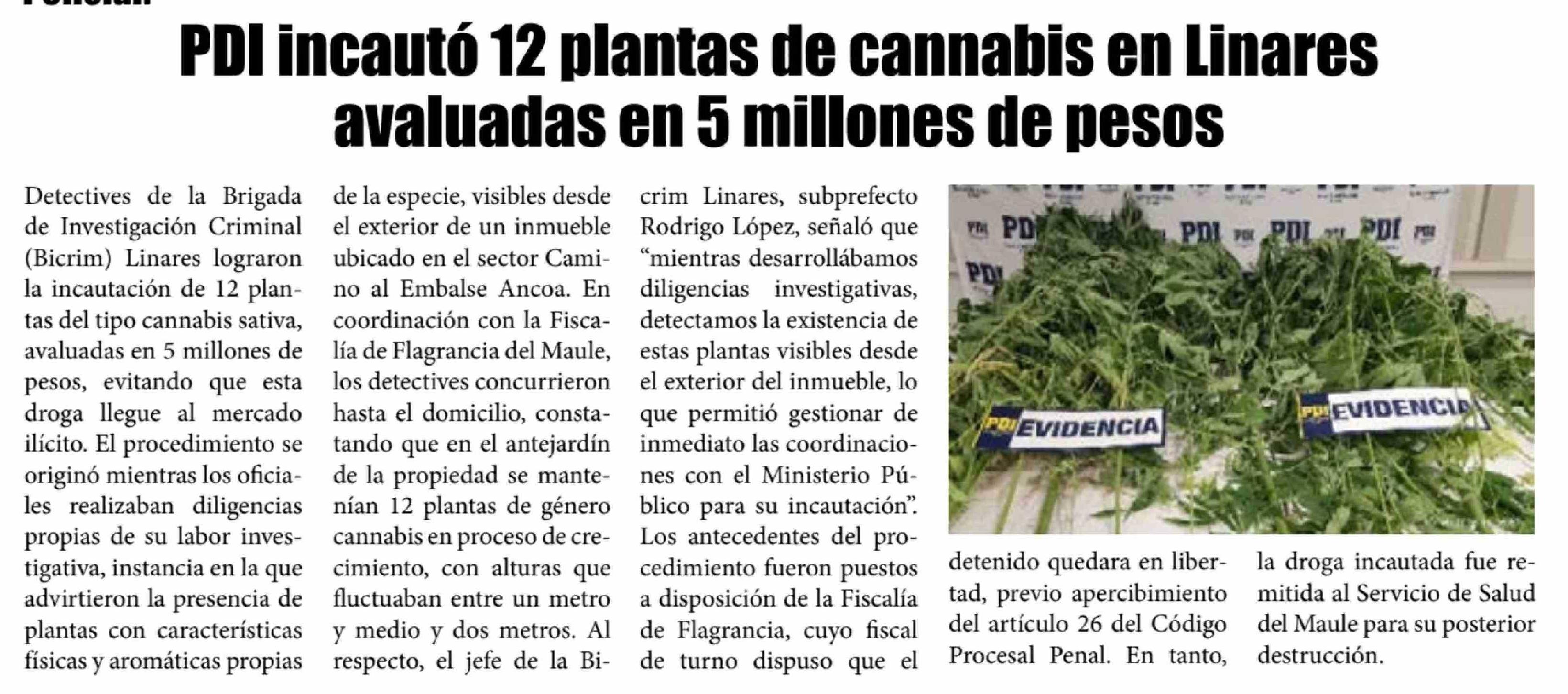 PDI incauto 12 plantas de cannabis en Linares avaluadas en 5 millones de pesos