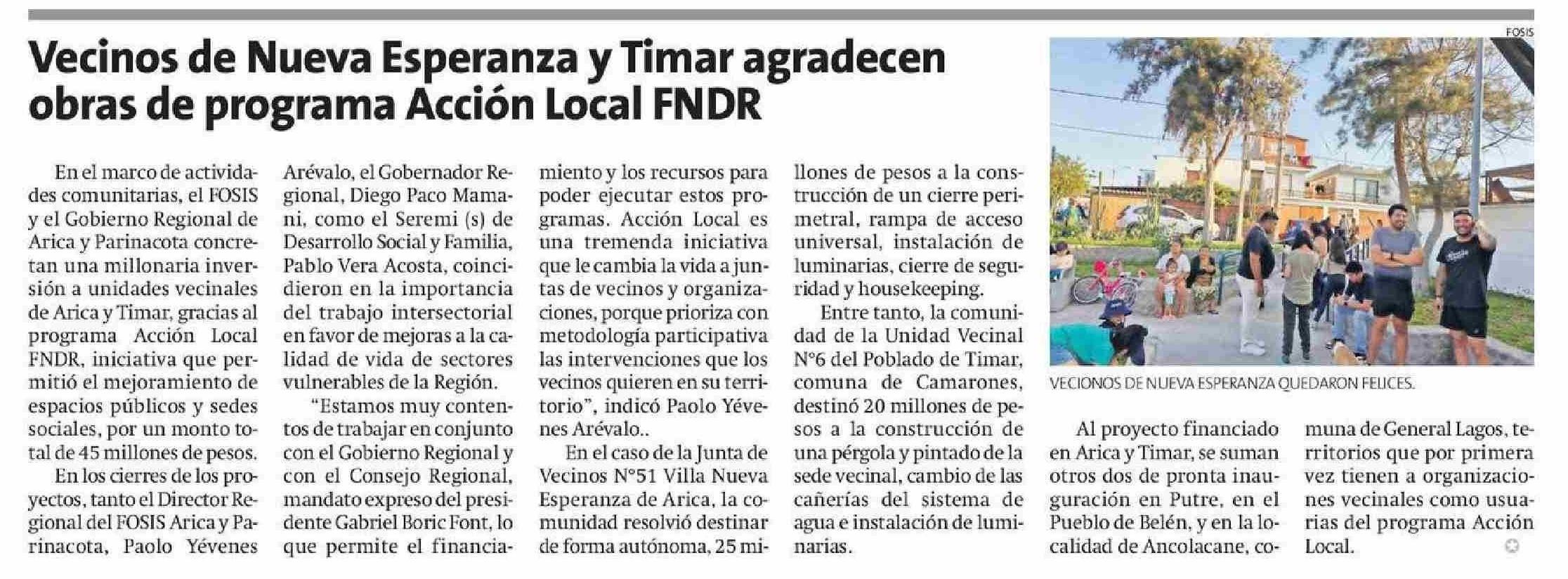 Vecinos de Nueva Esperanza y Timar agradecen obras de programa Acción Local FNDR