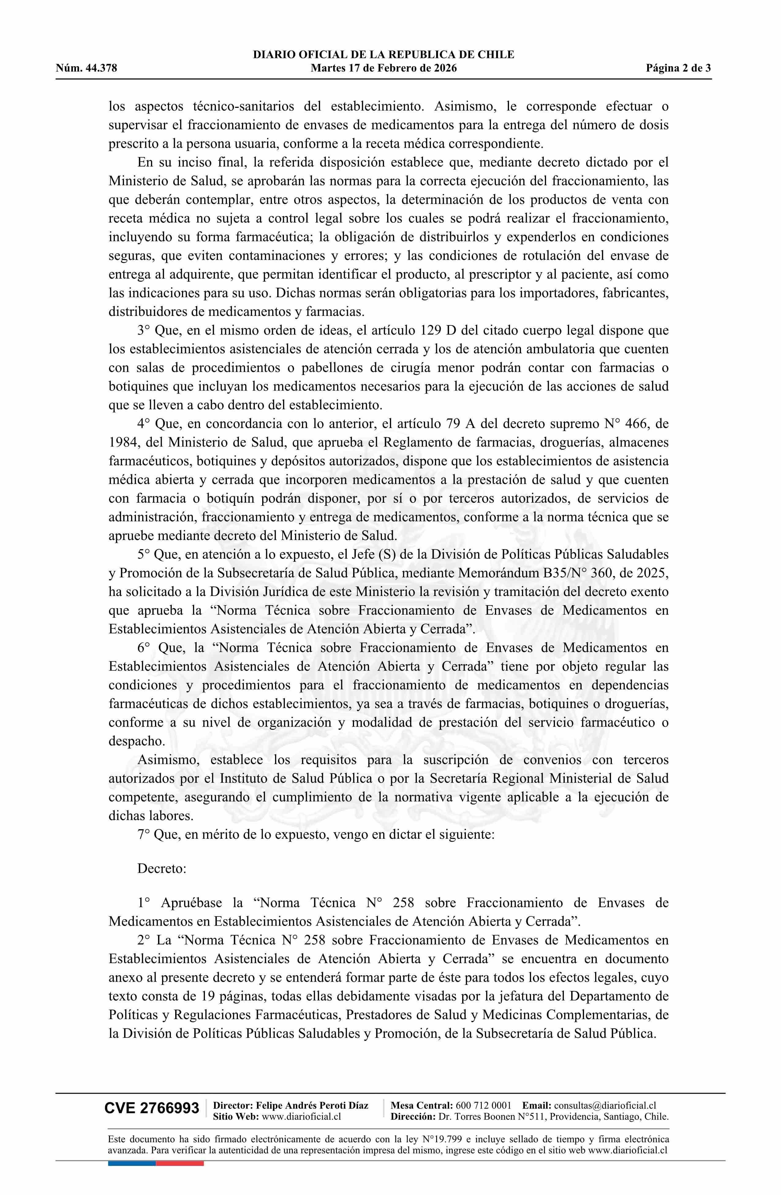| Título: | Decreto exento número 15, de 2026.- Aprueba norma técnica N° 258 sobre fraccionamiento de envases de medicamentos en establecimientos asistenciales de atención abierta y cerrada |