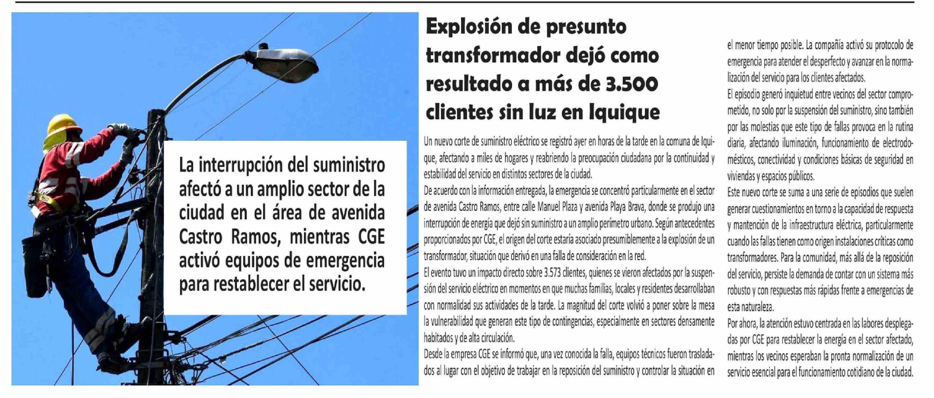 Explosión de presunto transformador dejó como resultado a más de 3.500 clientes sin luz en Iquique