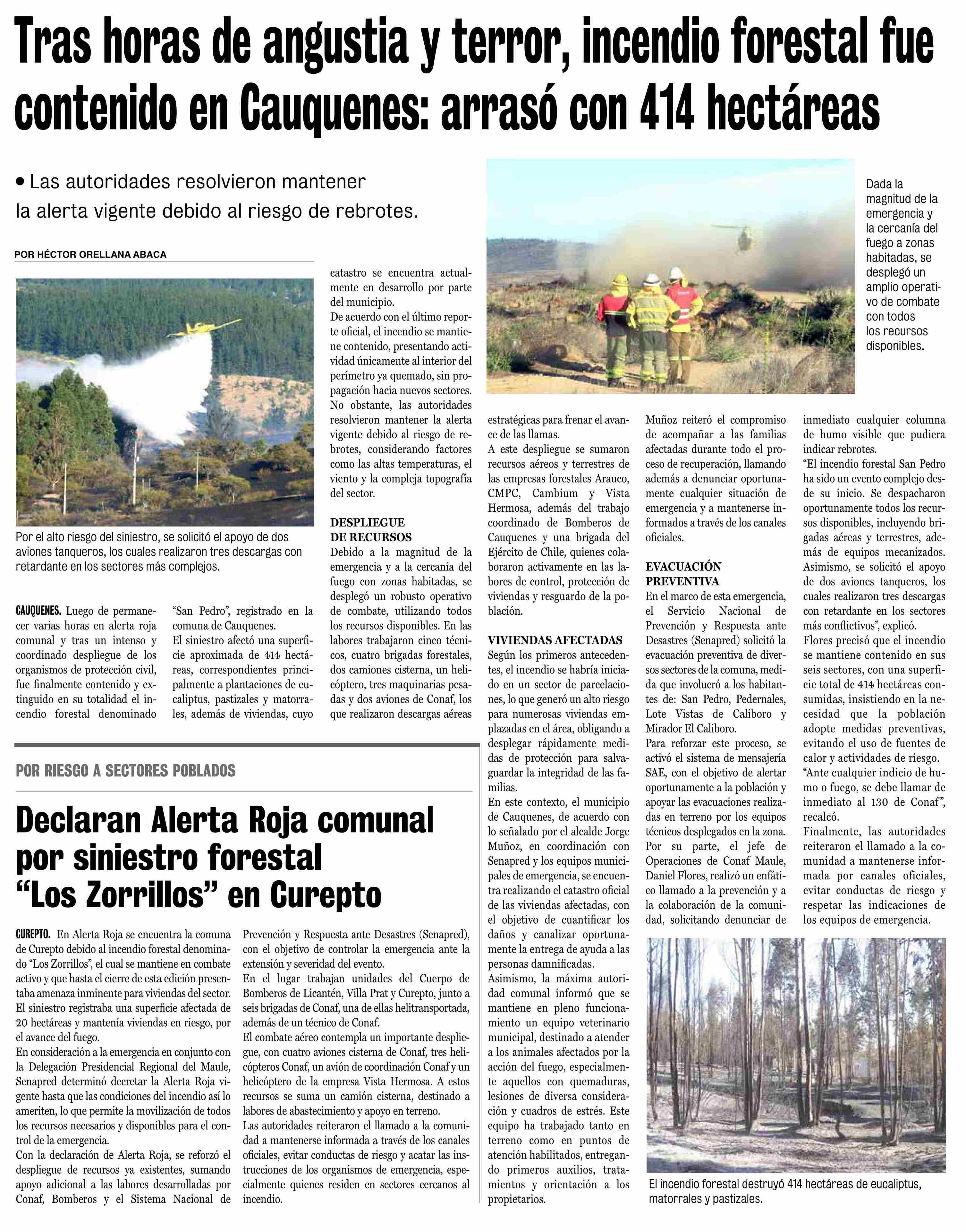 Título: Tras horas de angustia y terror, incendio forestal fue contenido en Cauquenes: arrasó con 414 hectáreas