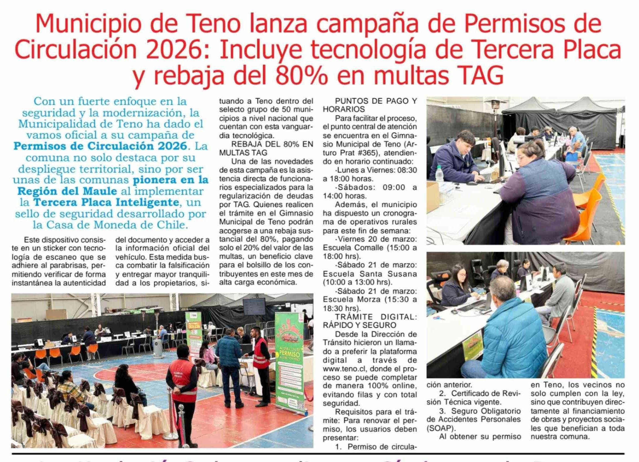 Municipio de Teno lanza campaña de Permisos de Circulación 2026: Incluye tecnología de Tercera Placa y rebaja del 80% en multas TAG