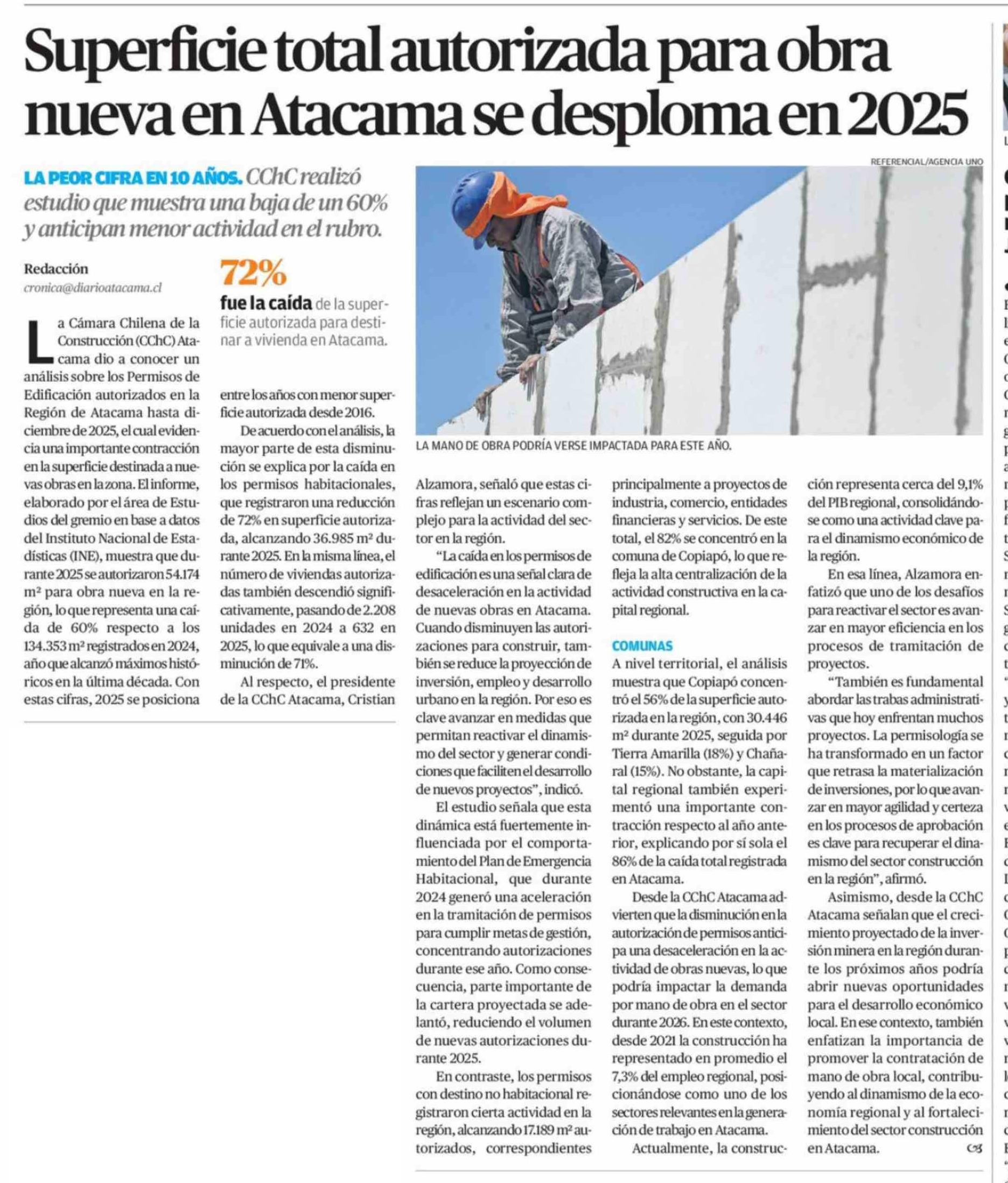 Superficie total autorizada para obra nueva en Atacama se desploma en 2025