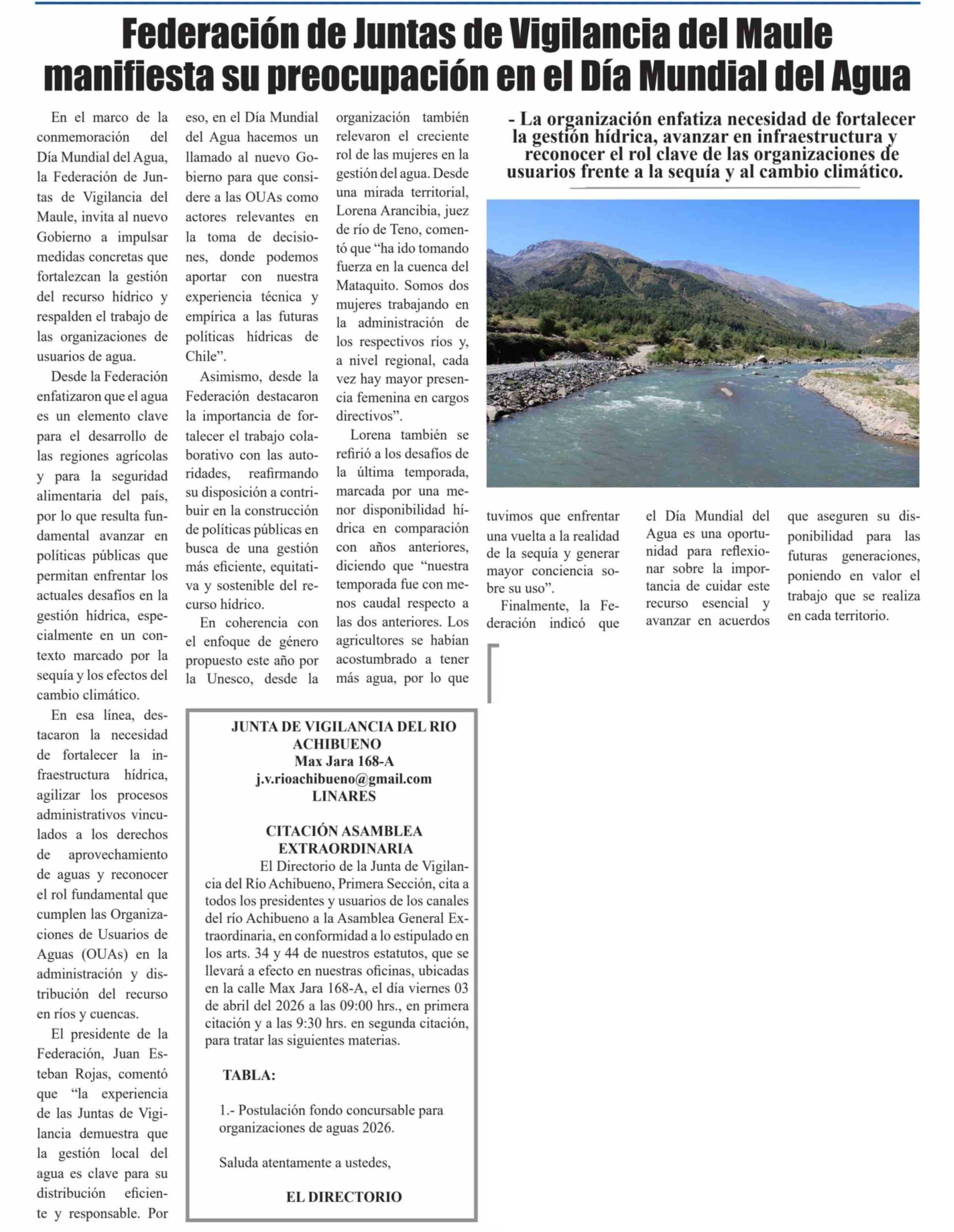 Federación de Juntas de Vigilancia del Maule manifiesta su preocupación en el Día Mundial del Agua