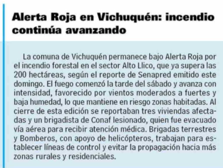 Título: Alerta Roja en Vichuquen: incendio continúa avanzando La comuna de Vichuquén permanece bajo Alerta Roja por el incendio forestal en el sector Alto Llico, que ya supera las 200 hectáreas, según el reporte de Senapred emitido este domingo. El fuego comenzó la tarde del sábado y avanza con intensidad,