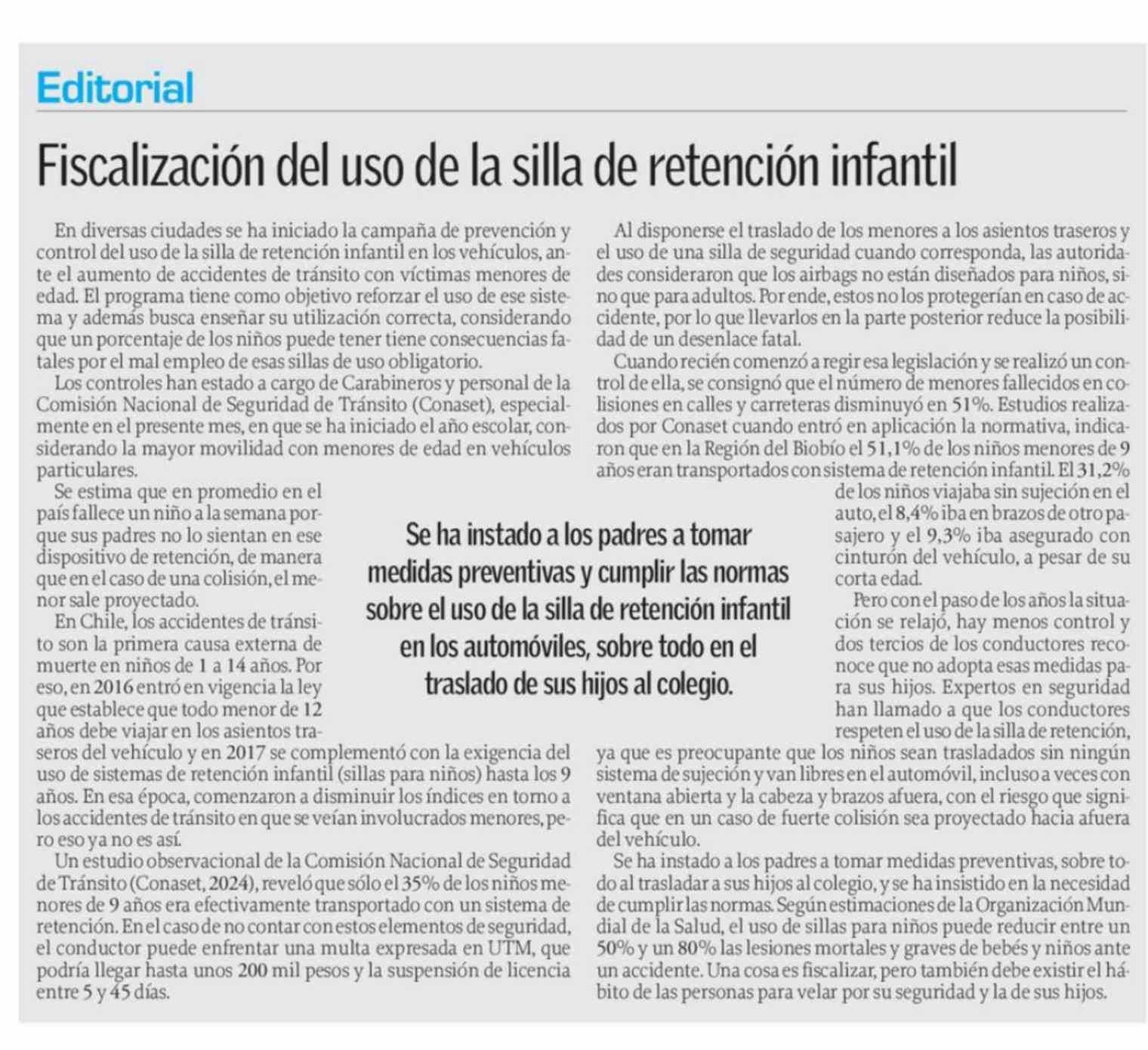 EDITORIAL: Editorial Fiscalización del uso de la silla de retención infantil